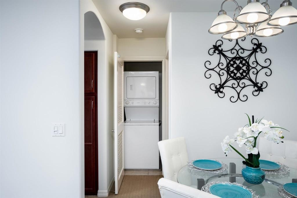 Rare corner unit w/ vaulted ceiling & some of the best views in complex. Laundry in unit, AC, D/W, granite, SS appliances, Cali blinds, walk-in closet, modern windows & sliding glass door to balcony with view & storage. Bedroom & LR share 0 walls with neighbors, & no one above! Gated complex has sauna, hot tub, gym, pools, dog runs, BBQ areas & LOW HOA! See last picture for all nearby grocery, restaurants, shops & more. This is the center of SD, ~15 mins. to everything (beaches, trails, parks, colleges, Convoy, UTC/LJ/SV/PB/OB/MV/KM/HC/NP/DT)! Complex Features: ,,,,, Equipment: Dryer, Washer Other Fees: 0 Sewer: Sewer Connected Topography: LL
