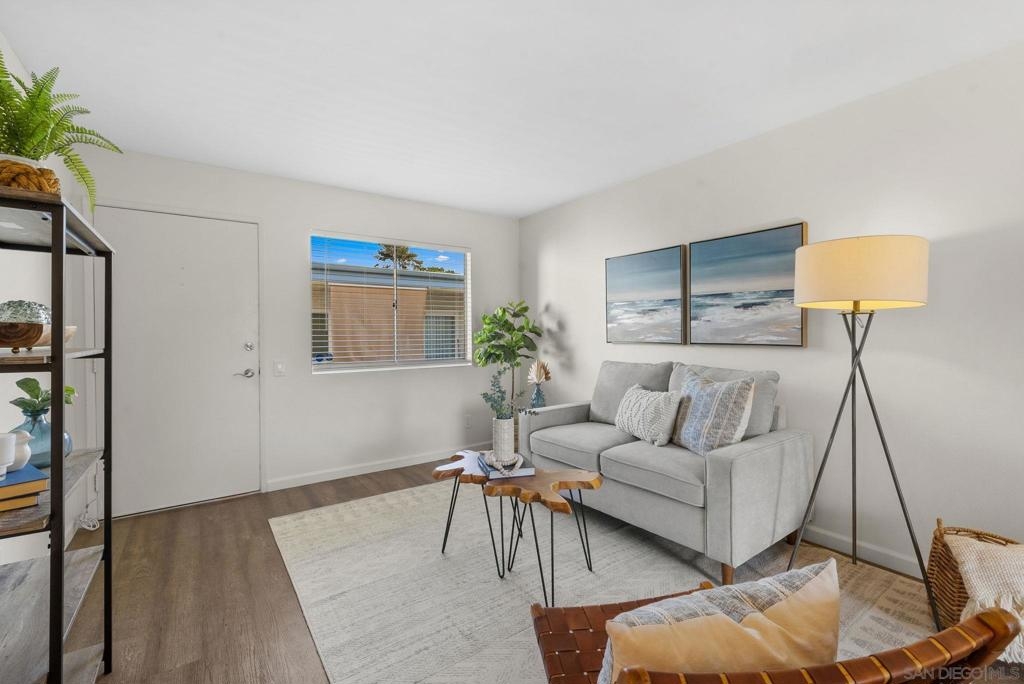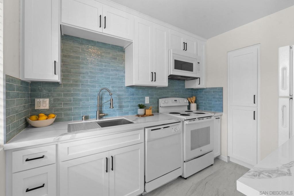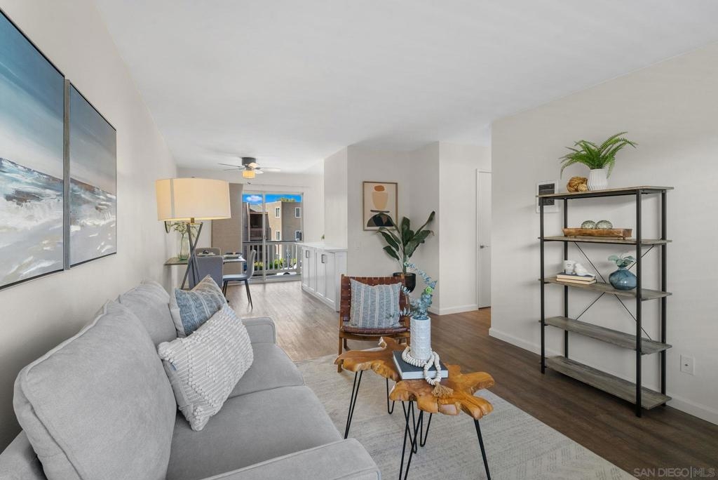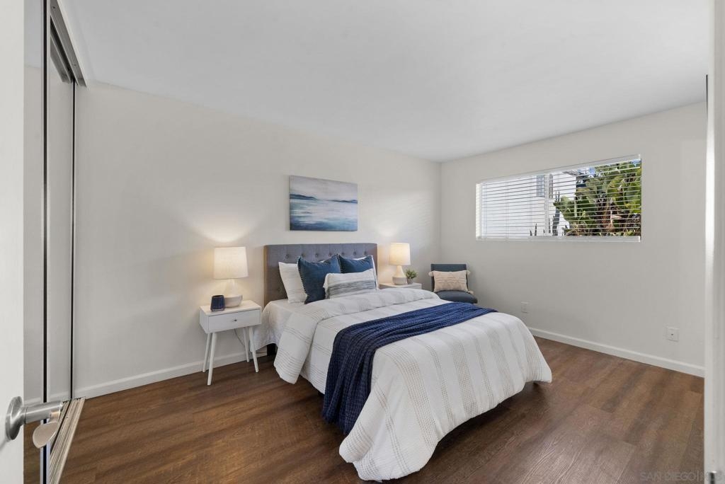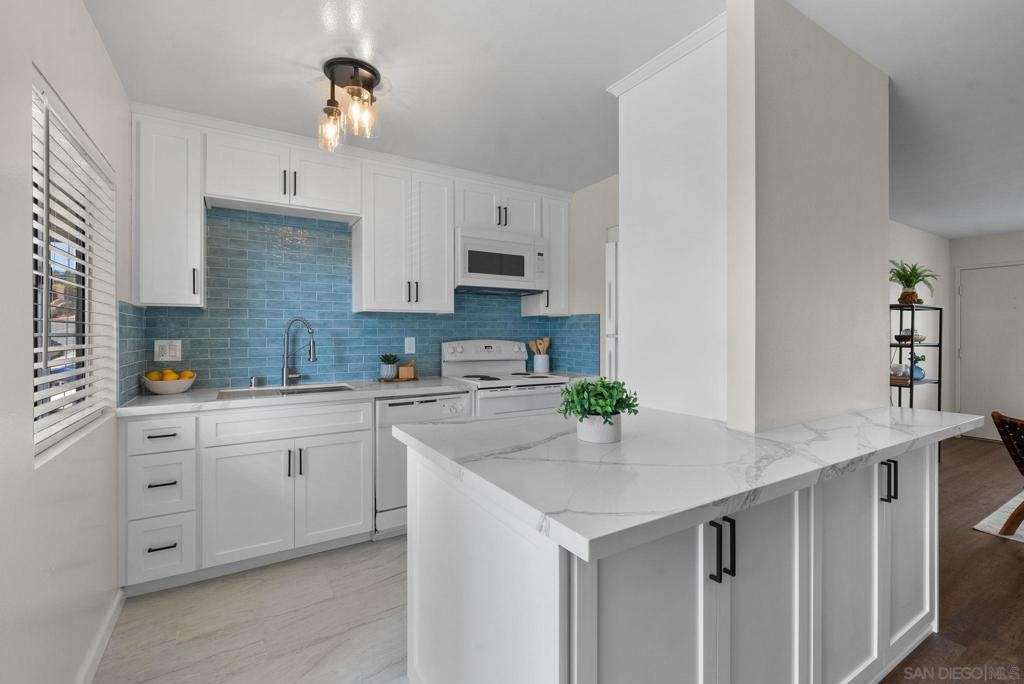 Welcome to this coastal inspired top floor updated 2-bed, 2-bath 790 sqft condo, perfectly situated in the heart of BayHo @ Bay View Terrace. This home offers a comfortable & chic living space with southwestern exposure, allowing for ample natural light throughout the day. Step inside to discover a thoughtfully updated interior, featuring a spacious living area that seamlessly flows into a light filled kitchen. New kitchen cabinets, quartz counters, tile backsplash, & Kraus workstation sink to make cooking a breeze! Both bathrooms have been tastefully updated with new vanities, fixtures, tile floors & refinished shower/tub. The flooring combines the warmth of laminate with the durability of tile, creating a versatile and easy-to-maintain environment. Relax & unwind on your private balcony to soak in a sunset view, or take advantage of the community pool/spa for a refreshing dip on sunny days. Pet friendly complex. Additional amenities include electric heat, common laundry facilities in the building, the convenience of 2 tandem assigned parking & just a few steps to access unit from parking. HOA $395/month inc water & trash. This condo is an ideal choice for those seeking a blend of comfort, style, & convenience in a vibrant San Diego location close to all amenities, beaches, shops, & restaurants that Mission Bay, Pacific Beach, & La Jolla offer. Close to Mission Bay Golf Course, Cadman Park, 3/4 mile to Balboa Trolley stop on blue line for easy commute going either to USD/UCSD or Downtown/Airport & easy access to I-5/52 freeways. Less than 3 miles to the Pacific Ocean! VA Approved Complex
