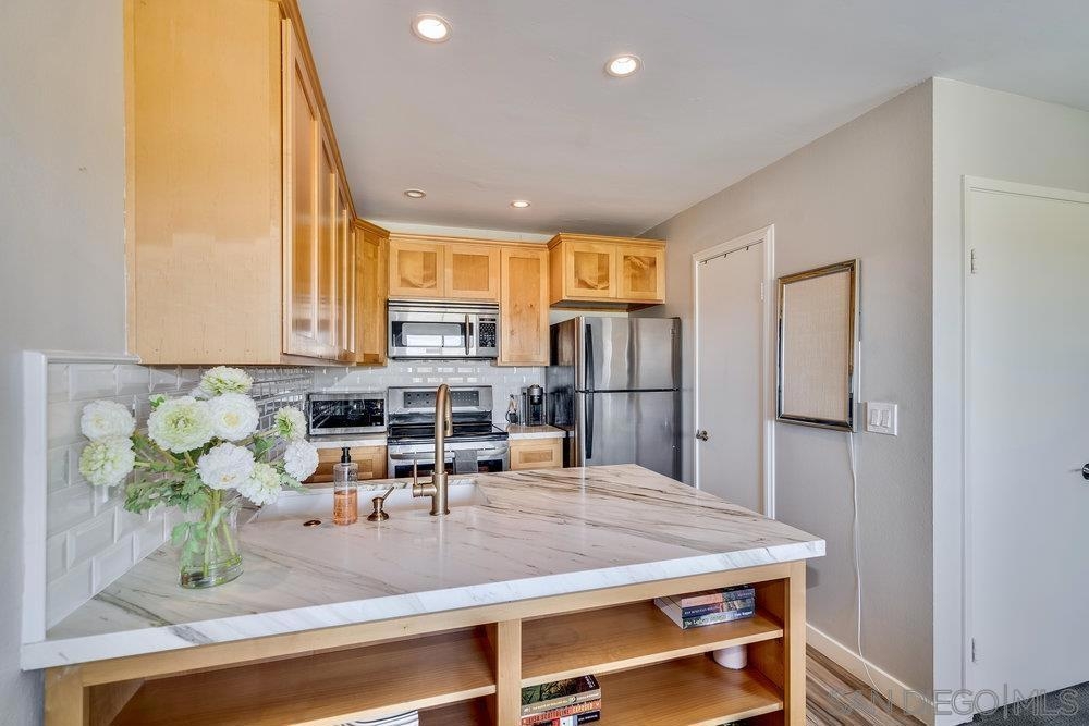 Bay Park gem! Located on the Tecolate Canyon Greenbelt , this unit overlooks the Golf course and entire canyon. Two story east facing unit features two bedrooms and 1.5 baths. Unit features remodeled kitchen, flooring, lighting and bathroom. Laundry in carport. Extremely clean and bright unit. Ready to move in!! Community pool, quiet area on private street. Walk to schools, central to all. Equipment: Range/Oven Sewer: Sewer Connected Frontage: Canyon
