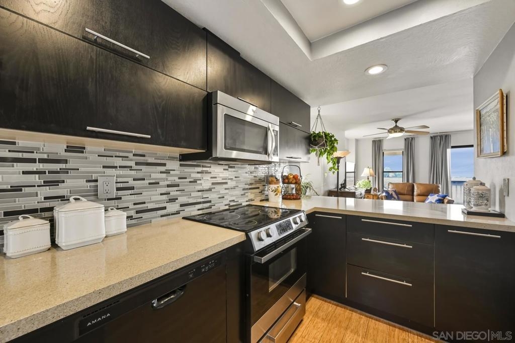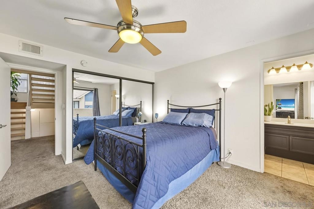 BEST DEAL IN THE NEIGHBORHOOD! Beautiful OCEAN and sunset views. VA Approved, end-unit townhome, attached 2 car garage plus additional assigned parking space in front of the unit. This residence offers a perfect blend of comfort, functionality, and coastal charm. Upon entry, you'll have the option to head upstairs to the main living area, where you'll find a spacious living room, dining area, and a modern kitchen equipped with appliances, most are about a year old. A convenient half bath and a west-facing balcony complete this level, offering peaceful ocean views — ideal for enjoying sunsets and fresh coastal breezes. From the entry level, you can also head downstairs to the private sleeping quarters, featuring two generously sized en-suite bedrooms - one with a balcony, perfect for comfort and privacy. Below the bedroom level, you'll find direct access to the attached two-car garage, which includes laundry hookups. A community, pool, spa, racquetball courts are an added bonus. Easy coastal access with Pacific Beach and Crystal Pier 3 miles away, 1 mile drive to Mission Bay. Accessible to all of San Diego with a bus stop 1 block away, 2 blocks to the Balboa Trolley station for travel to UTC, Downtown, and beyond. — don’t miss this fantastic opportunity!