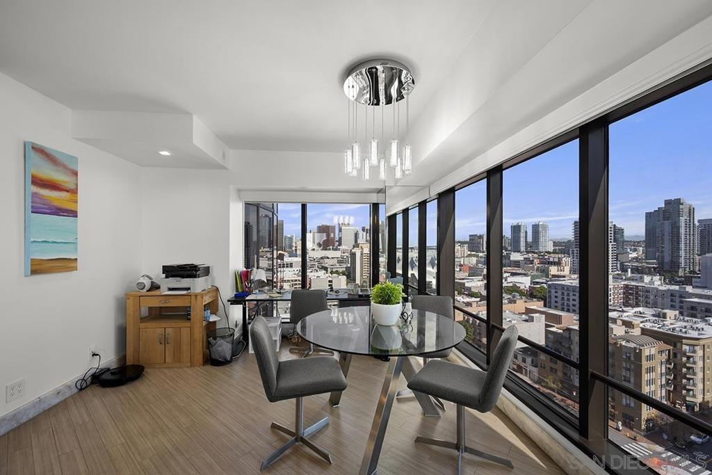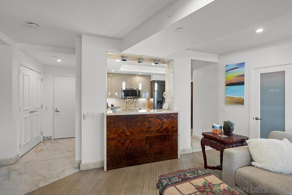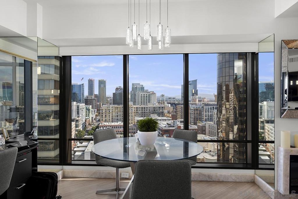 Experience waterfront living at Harbor Club with unobstructed views of San Diego Bay, the Coronado Bridge, and Petco Park beyond the skyline. Banks of windows fill the residence with natural light and frame the ever-changing waterfront, from sailboats gliding by during the day to city lights reflecting on the water at night. The open living area extends to a private balcony, ideal for enjoying the views or hosting guests, while the bedroom also offers direct balcony access, creating a seamless indoor-outdoor connection and a front-row vantage point from sunrise through evening. The kitchen is well appointed with stainless LG appliances, custom marble countertops and backsplash, recessed and under-cabinet lighting, and an eat-at bar with added storage. The primary bedroom features a remodeled ensuite bath with a step-in shower. Additional highlights include an electric fireplace, stackable Maytag washer and dryer, and a secured parking space with EV charging capability. Claim a Marina District home where each day unfolds with water, sunlight, and iconic views. Residents of the Harbor Club are treated to an array of lavish, resort-inspired amenities that encompass a round-the-clock front desk service, a state-of-the-art gymnasium, an exquisite pool deck, a sociable club room, and a versatile library/business center, among numerous other perks. Nestled in the much-coveted Marina District, the Harbor Club boasts unparalleled ease in traversing the neighborhood on foot, granting effortless access to an array of transportation options, delectable dining establishments, retail therapy, the iconic ballpark, the pulsating Gaslamp Quarter, the artsy East Village, and the scenic Embarcadero – an idyllic setting for serene walks alongside the bay.