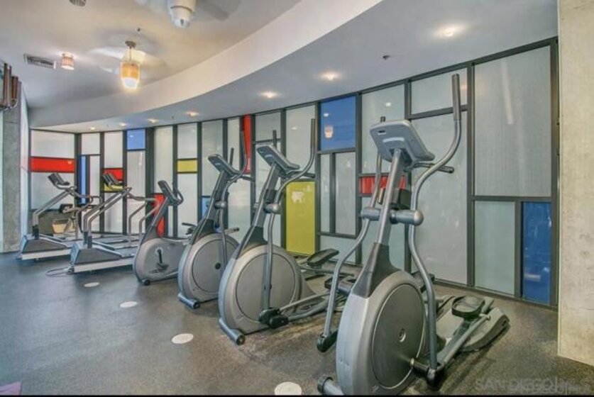 Rare Two Story Walk-Up Unit in the Highly Desirable M2i Building. This modern, reverse floor plan offers a unique living experience with high-end finishes throughout. The spacious primary bedroom features an oversized, fully custom walk-in shower, California Closets build-outs, and wide-plank tile flooring. A stunning spiral staircase leads to the second floor, where 12-foot ceilings and an open concept layout create an inviting atmosphere. Floor to ceiling windows provide abundant natural light, highlighting custom built-in shelving and exposed concrete accents. The kitchen is equipped with a premium LG fridge, complete with a custom ice maker, gas stainless steel cooking and modern fixtures. The private balcony offers city views and overlooks Jacaranda trees. One of the standout features of this unit is the direct access from the downstairs bedroom to the heart of East Village. Step outside your door and immerse yourself in one of San Diego’s most vibrant and desirable neighborhoods, just steps away from trendy restaurants, shops, and the lively energy of the area. The building also boasts a rooftop deck with built-in grills and a fireplace, a newly remodeled fitness center, and a lush interior courtyard. With Petco Park, Michelin-starred restaurant Callie, and the Gaslamp Quarter just blocks away, this unit offers an exceptional blend of modern luxury and unbeatable location.