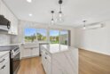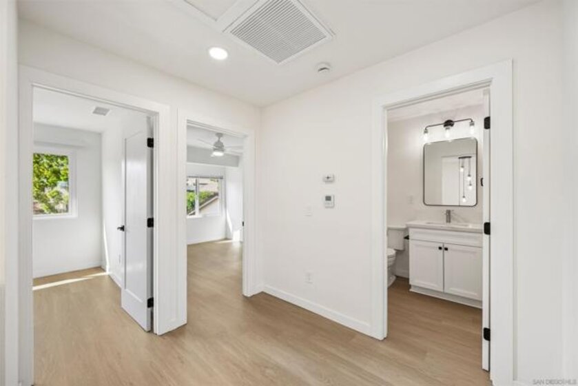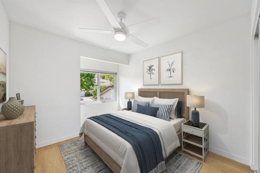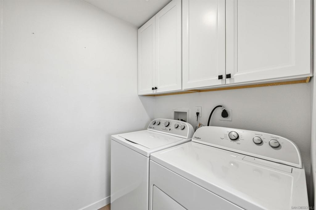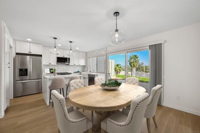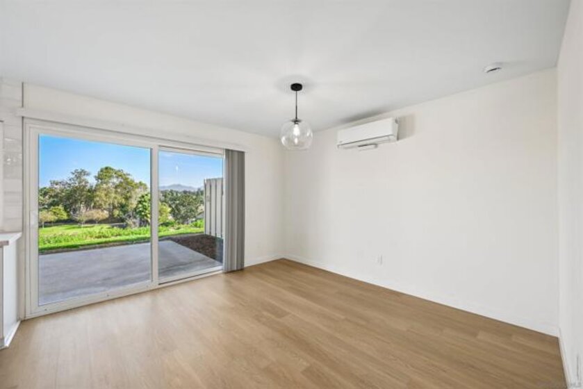 Prepare to be impressed by this showcase townhome located in the highly sought-after Westwood Townhomes community, perfectly positioned on a premium lot with picturesque park and mountain views! Designed for effortless indoor-outdoor living, the home features spacious patios at both the front and back—ideal for al fresco dining, relaxing, or entertaining while taking in the serene surroundings and mesmerizing views. Extensive renovations elevate every corner of the home, including luxury vinyl wood plank flooring, recessed lighting, new white cabinetry, countertops, stylish lighting and fixtures, new Milgard windows and sliders and mini split systems. The gourmet kitchen is a true chef’s delight, showcasing quartz countertops, a tiled backsplash, farmhouse sink, pendant lighting, stainless steel appliances, and a separate island with a striking waterfall edge—perfect for casual dining or bar seating. Just off the kitchen is a convenient laundry room with new washer and dryer, along with a beautifully updated downstairs bathroom featuring a quartz countertop. A modern staircase leads you upstairs to the bedrooms, where the spacious primary bedroom serves as a true retreat, complete with tranquil views, dual closets, and an en-suite bathroom with quartz countertops and a large walk-in shower wrapped in white marble-look tile and elegant herringbone marble accents. Secondary bedrooms are located just down the hall and share a well-appointed bathroom with a tiled tub/shower combo and white quartz countertop. A separate detached garage adds everyday convenience. Residents enjoy exclusive membership to the Westwood Club offering a pool, spa, sauna, pickleball and tennis courts, gym, BBQ area, basketball court, miniature golf, clubhouse, playground, and scenic walking paths. Located in the award-winning Poway Unified School District and close to entertainment, restaurants, shopping, transportation and just minutes to the beaches. This is an exceptional opportunity to own this showcase home!