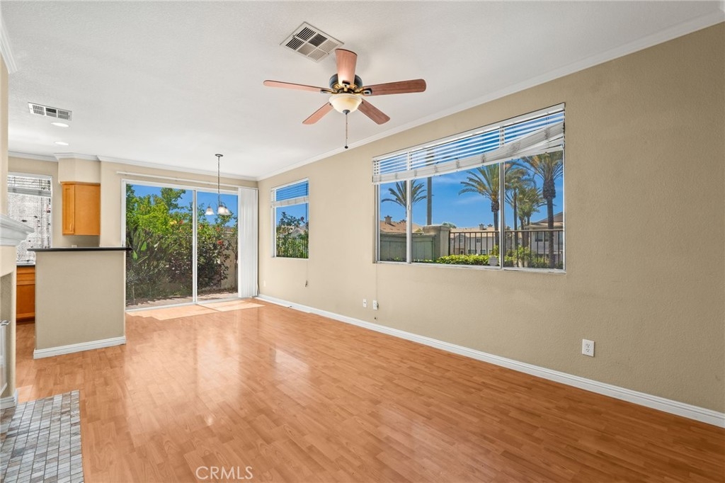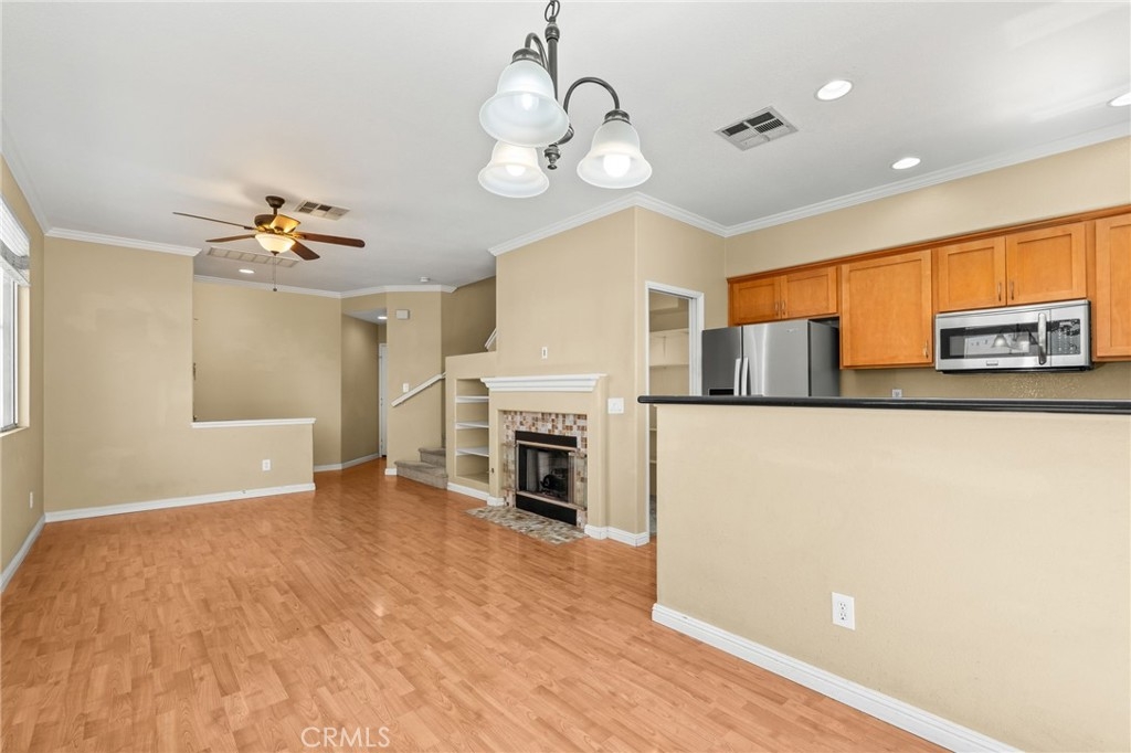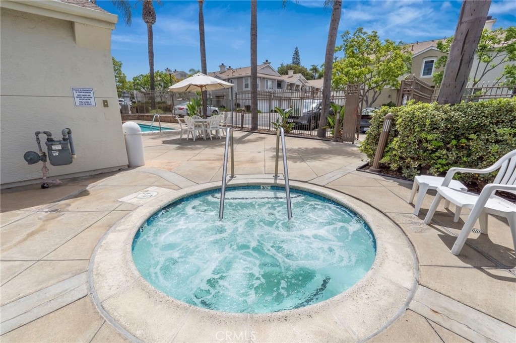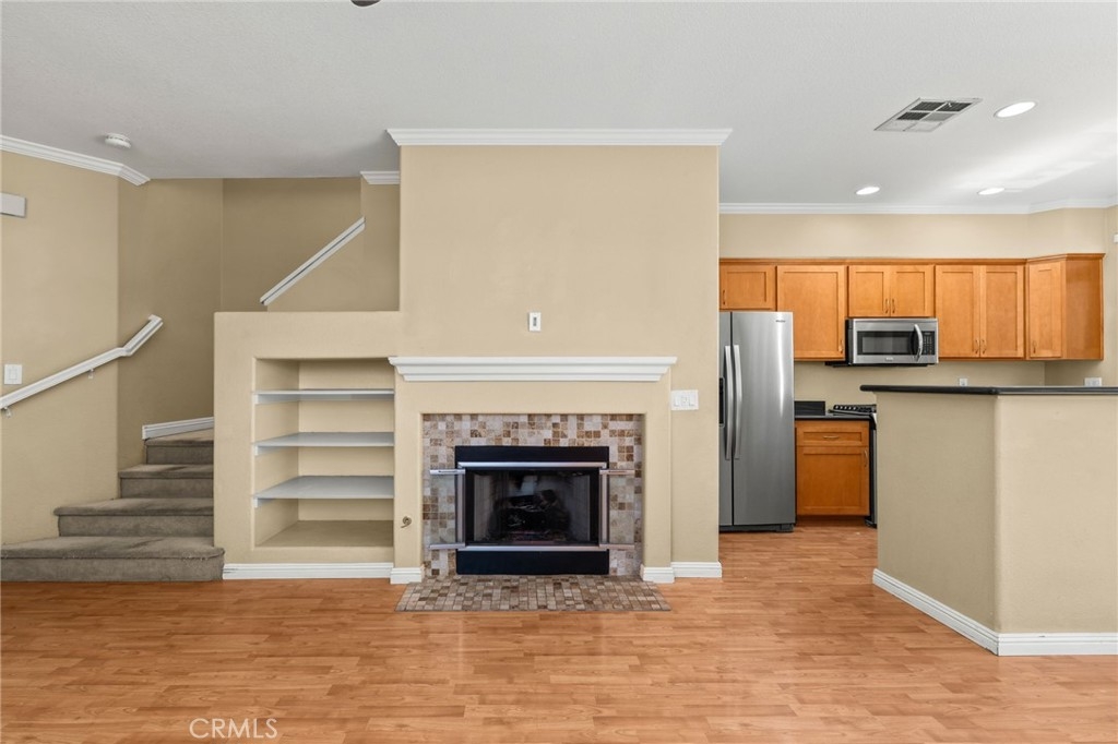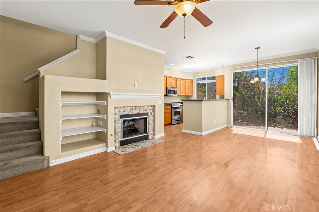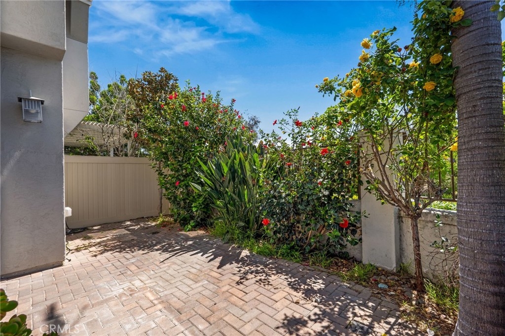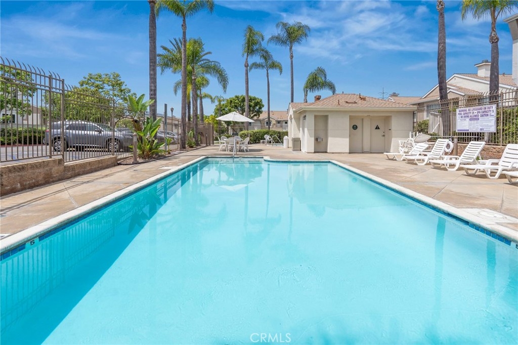 End units like this one rarely come up, a wrap-around yard, and an attached garage give this home a feel that most in the complex simply don't have. The kitchen features quartz and granite counters, Maple Shaker cabinets with soft-close doors, top-tier appliances, and a walk-in pantry with wine storage. Every bath has been redone as well. The primary suite has dual sinks and a Travertine shower. Each bedroom has its own full bath, and there's a third guest bath on the main floor. A fireplace anchors the living room, which opens out to a pavered wrap-around yard. Central air and heat, soft water, crown molding, and paneled doors throughout. The attached garage includes overhead storage, plus there's assigned parking. Community pool and spa nearby.
