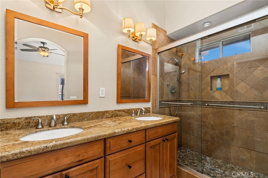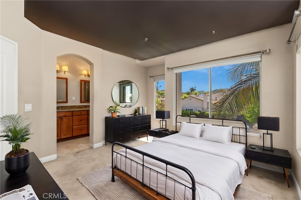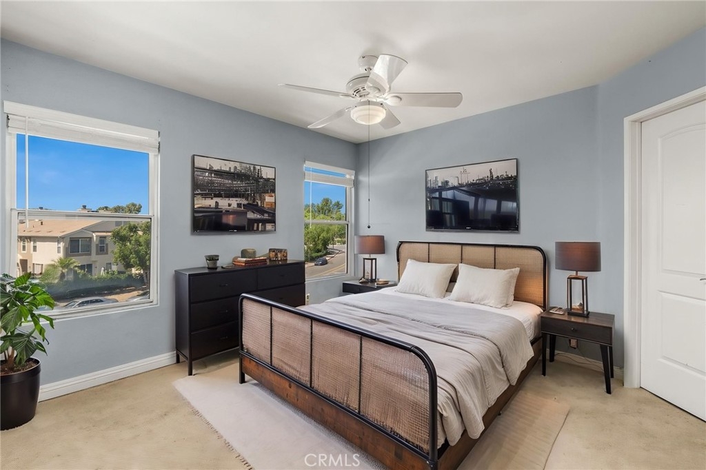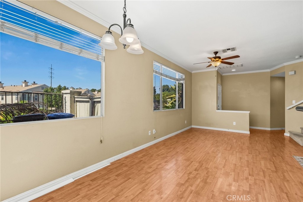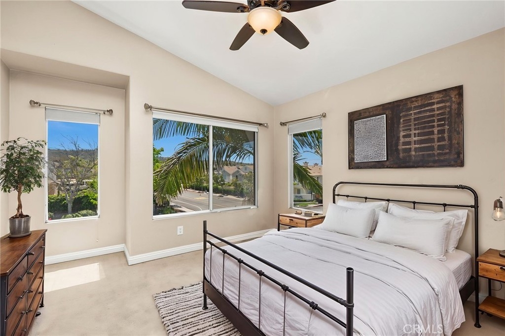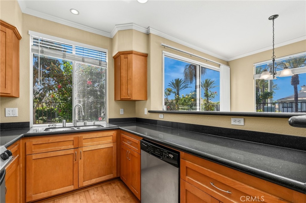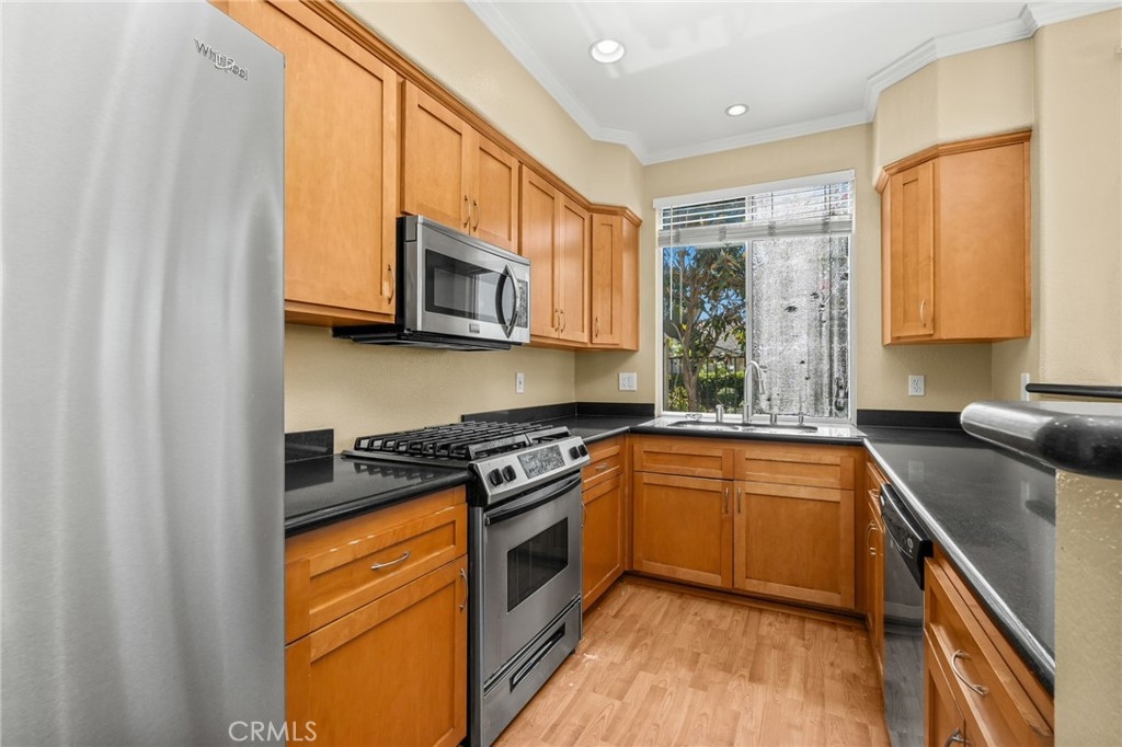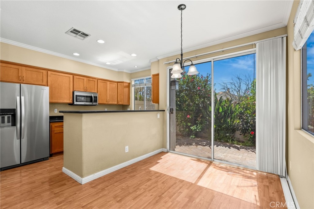 End units like this one rarely come up, a wrap-around yard, and an attached garage give this home a feel that most in the complex simply don't have. The kitchen features quartz and granite counters, Maple Shaker cabinets with soft-close doors, top-tier appliances, and a walk-in pantry with wine storage. Every bath has been redone as well. The primary suite has dual sinks and a Travertine shower. Each bedroom has its own full bath, and there's a third guest bath on the main floor. A fireplace anchors the living room, which opens out to a pavered wrap-around yard. Central air and heat, soft water, crown molding, and paneled doors throughout. The attached garage includes overhead storage, plus there's assigned parking. Community pool and spa nearby.