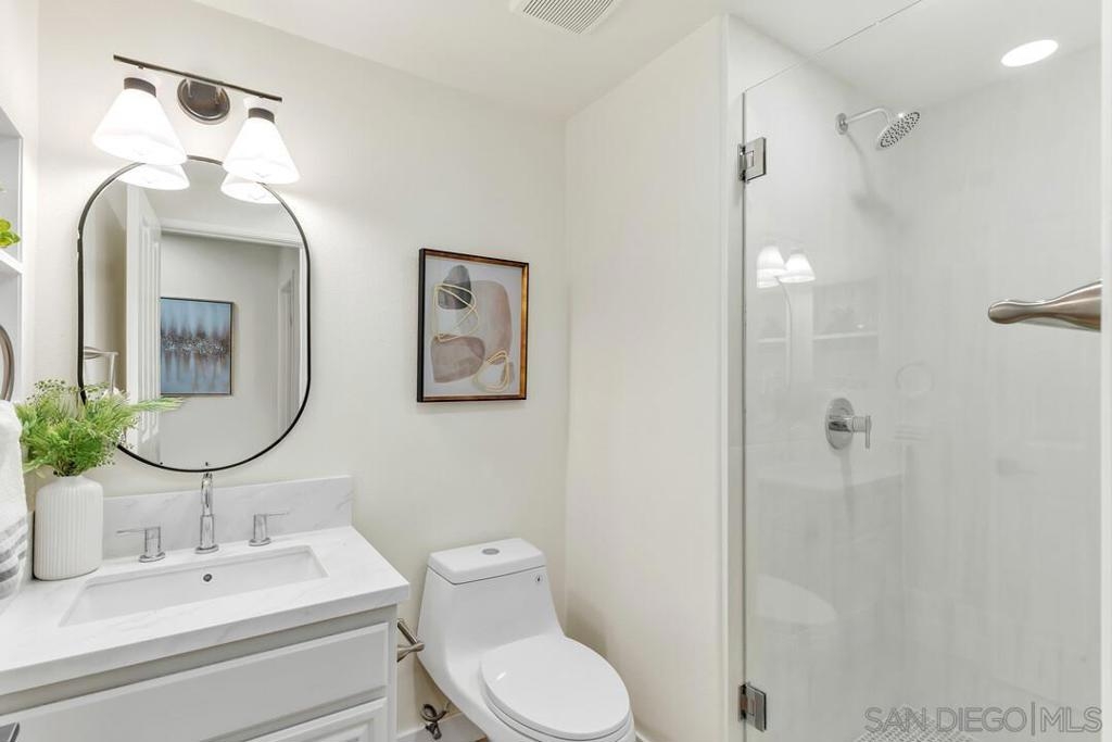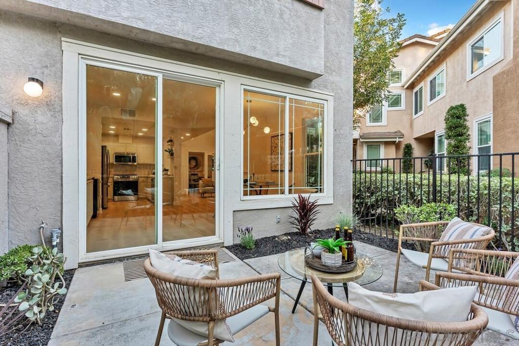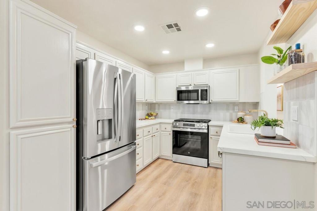 Location, Location, Location! Welcome home to the highly sought-after Windham community, perfectly situated in the heart of Carmel Mountain Ranch. Opportunities here are rarely available, with the last sale occurring over a year ago. Talk about walkability! You are under half a mile from the Carmel Mountain Plaza, placing bakeries, Trader Joe's, major grocery stores, shops, restaurants, and Costco within easy reach, with the local library just a short distance further. This exquisitely and gorgeously renovated townhome offers an unparalleled blend of quaint living, central convenience, and stylish upgrades, leaving no portion of the home untouched. Step inside to an inviting open-concept living area where heightened ceilings and abundant natural light highlight stylish LVP white oak flooring throughout. The focal point of the living space is a newly tiled fireplace, perfect for cozy evenings. The chef’s kitchen is a true masterpiece, featuring elegant greige cabinetry, quartz countertops, a charming farmhouse sink with brass-tone finishes, and all-new GE stainless steel appliances. A convenient beverage station area, serving buffet, and eat-in dining space make this kitchen both beautiful and highly functional. This versatile floor plan thoughtfully includes a full bedroom and bathroom downstairs, ideal for guests or a flexible home office space. A dedicated laundry room is also conveniently located on the main level. Upstairs, the updated bronze pendant lighting in the entry hall leads you to the two remaining bedrooms. The spacious primary suite is a sanctuary, boasting a large walk-in closet and a spa-like bathroom with dual showers and tubs and a tasteful accent niche. Enjoy your private backyard space perfect for relaxing or entertaining. Additional features include ample storage throughout the home, a brand-new water heater, and a new roof. Best of all, this property is zoned for the award-winning Poway Unified School District. With low HOA dues and a two-car garage, this turn-key property is a rare find!