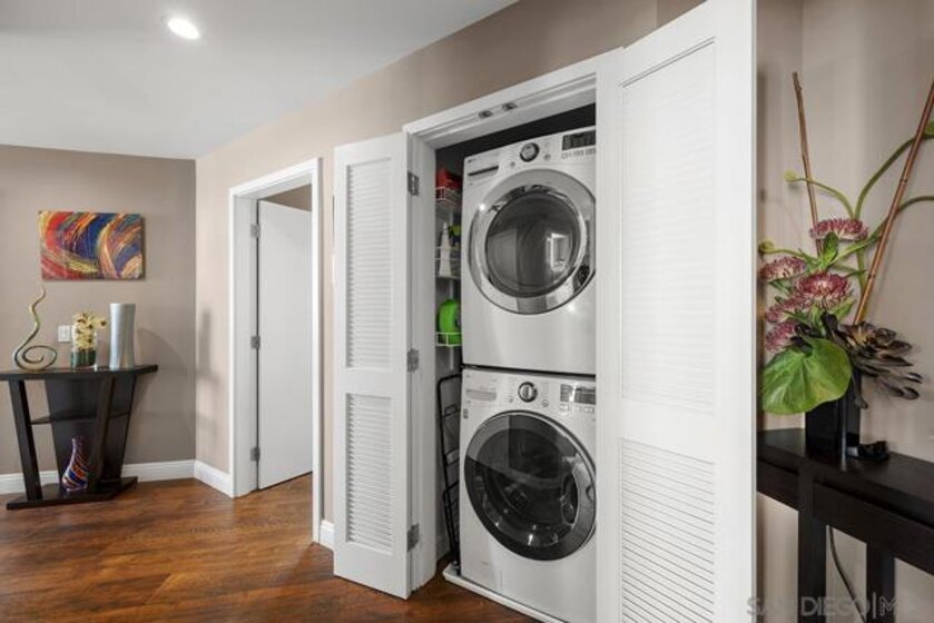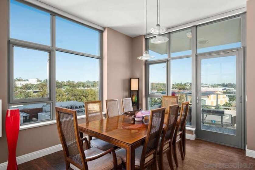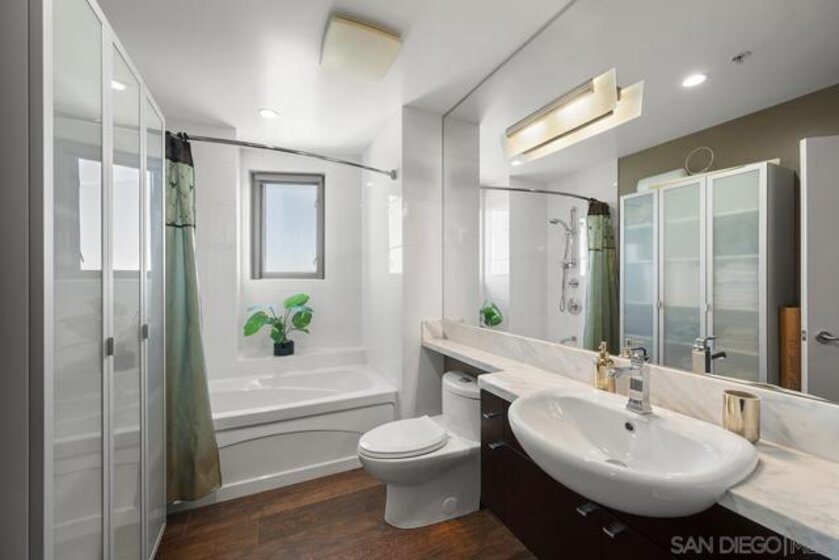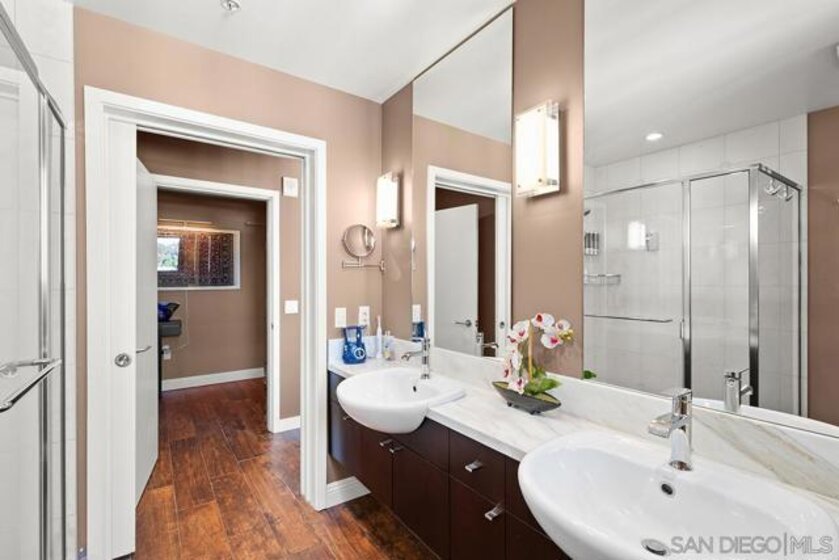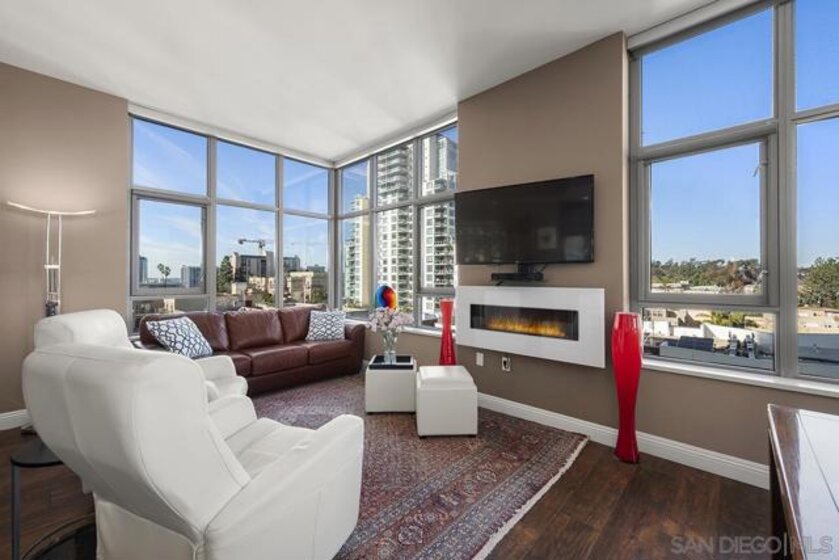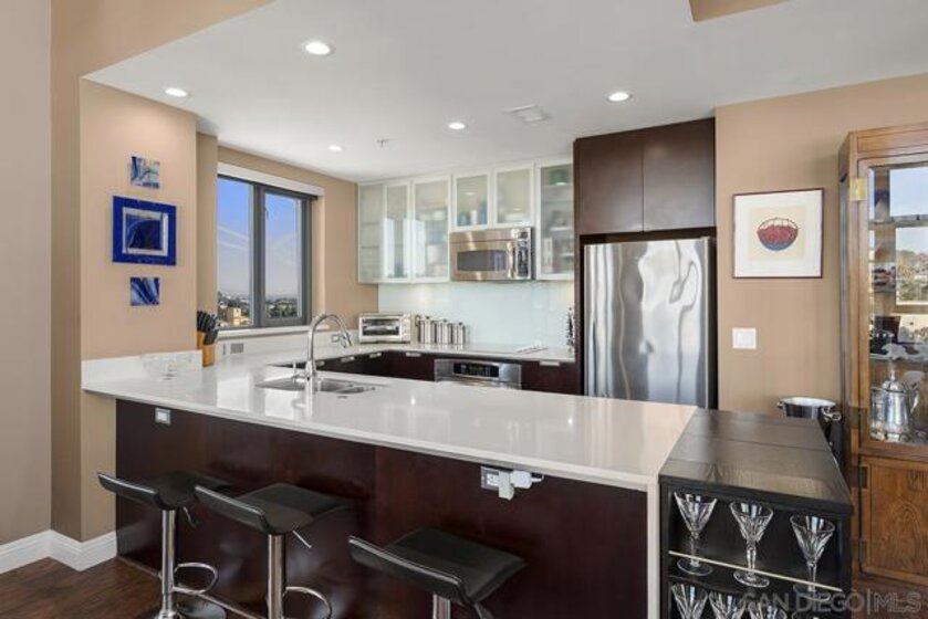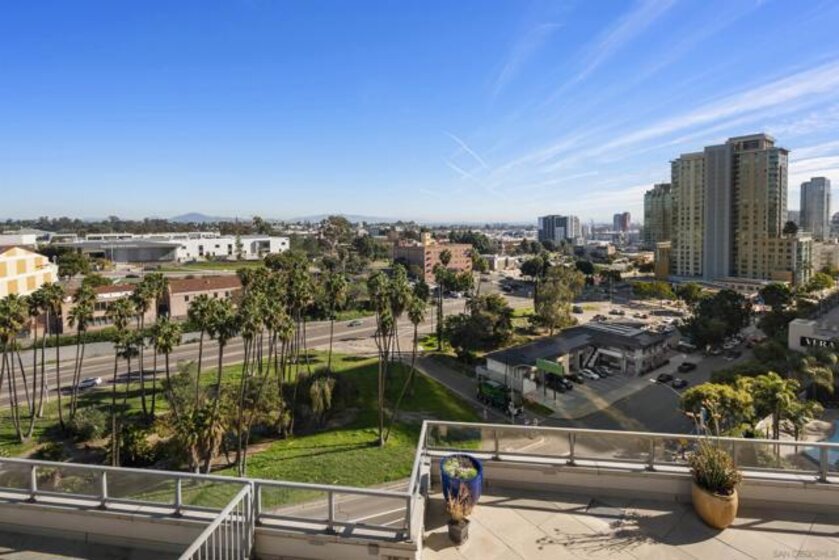 Don’t miss out on this premium 9th floor residence in Aria encompassing dramatic panoramas to the north, south, west, and east. Views of the skyline flow into Balboa Park’s treetops as well as glimpses of the bay and Coronado Bridge. Enjoy Downtown’s vibrant energy from the expansive PRIVATE corner balcony that is perfect for morning coffee, sunrises, or relaxing evenings. Inside, the open-concept living area is both refined and inviting, highlighted by wood-look tile flooring, floor-to-ceiling windows with custom screens added, and soaring ceilings (higher than other floors) that fill the space with natural light and elevate its modern aesthetic. The open kitchen features stainless appliances, stone countertops, recessed lighting, and a convenient eat-at island, ideal for everyday living and entertaining. The primary bedroom offers an ensuite bath with a step-in shower and dual vanity. The second bedroom features sleek custom built-in cabinetry with dual desks, offering versatile use as a bedroom, a home office or both! And tandem parking makes for effortless urban living. Located in the highly desirable Cortez Hill neighborhood, Aria provides a peaceful residential setting just moments from all the excitement Downtown has to offer. Perched atop Cortez Hill, Aria perfectly balances serenity with city living. Completed in 2008, this boutique community of just 137 residences offers an elevated sense of privacy, quite literally above the buzz of Downtown. Tucked away from the noise yet moments from the action, residents enjoy easy access to Balboa Park, as well as the dining, nightlife, and waterfront attractions of Downtown San Diego. With seamless freeway access nearby, the entire region is at your fingertips. Residents of Aria enjoy amenities such as a well-appointed fitness center, a sleek lap pool and spa, and an elegant club room complete with a catering kitchen and wet bar, ideal for entertaining or unwinding in style. At Aria, refined living meets an unbeatable hilltop vantage point, offering a truly elevated Downtown lifestyle.