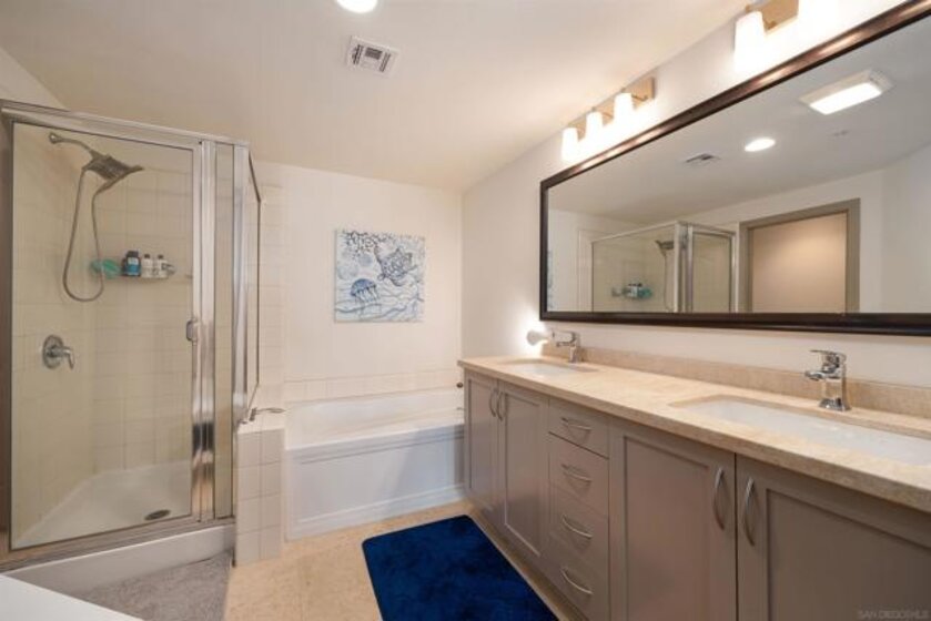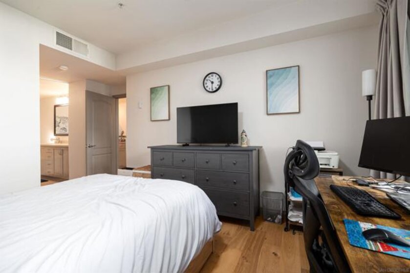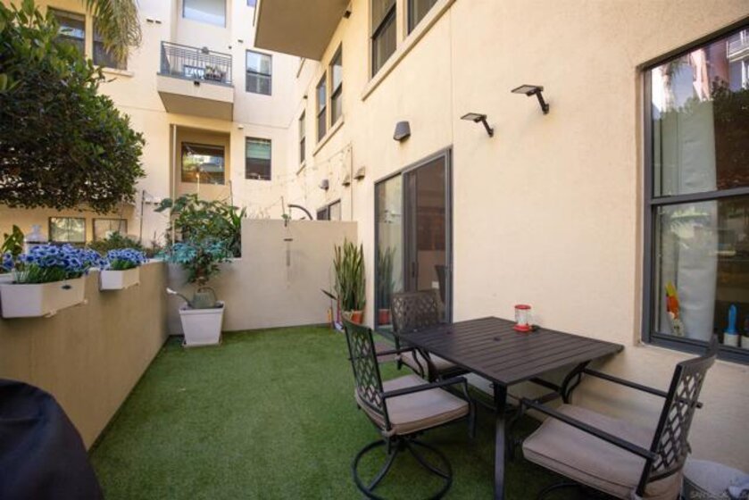 Well-appointed two-story townhome offering true convenience in the heart of Little Italy. The main level features an open living/dining space w/ guest bath and full laundry room, side-by-side full side laundry, all flowing seamlessly to a private terrace overlooking a serene, park-like courtyard. Thoughtful upgrades include DuChateau hardwood flooring, honed limestone counters, and stainless steel appliances. Upstairs, you'll find two generously sized bedrooms and two full baths. The primary suite includes a renovated spa-style bathroom and a spacious walk-in closet. Rare bonus: two side-by-side parking spaces in a secure garage. Recently upgraded DOMA community areas with more to follow. Impressive Gym room and amazing views from DOMA rooftop for sunsets and the bay. Step outside and you’re moments from world-class dining, the waterfront, and everything Little Italy is loved for. DOMA VA Approved (001250)