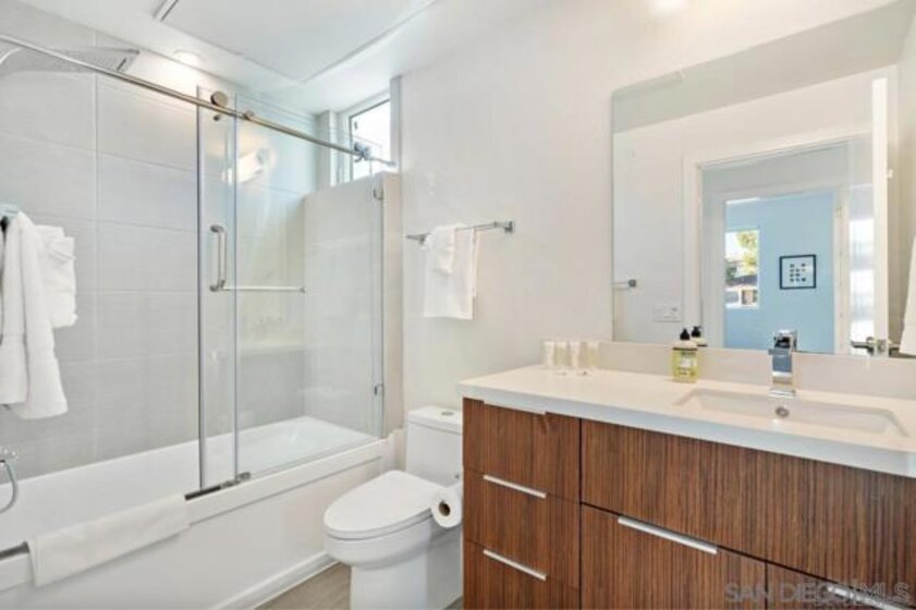 Luxury Row Home. Strictly Electric Home with 14+ OWNED Solar Panels = Net Zero Energy Home! Huge cost savings, potentially little to no SDGE bill. Located in charming Golden Hill, just minutes from Downtown San Diego. This Spacious 3 Story Row Home features 1,328 sq ft with 2. bedrooms and 2.5 bathrooms. Each en-suite bath, a 2-car garage, and multiple balconies to soak up the neighborhood views with floor-to-ceiling sliding doors. Kitchen and Baths feature custom cabinets, quartz counters, and stainless steel appliances. This home was built highly efficiently! No MelloRoos!