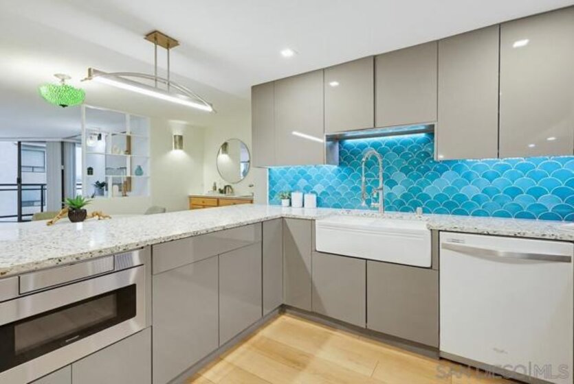 Welcome home! This stunning 2BR, 2BA single level unit features expansive Southwest views of Sail Bay, from the balcony, as well as floor-to-ceiling windows in the living room & primary bedroom. Remodeled kitchen w/high end Vetrazzo counters, hand-crafted cabinets, teal backsplash & unique under-cabinet lighting. Lovingly updated w/custom lighting, tons of storage, remodeled bathrooms, private laundry, Coretec Plus enhanced oak floors & cool shadow box walls that no other unit has. Riviera Shores is a secure bayfront ADA friendly building w/a pool, spa, direct beach access & secured parking. Plus it is VA approved. Palm trees, sand, night lights & the bay are everywhere you look w/ gorgeous afternoon light & dynamic sunsets. Walls of windows, a 100 square foot bay view deck & sun drenched rooms remind you every day how lucky you are to live here! This special legacy property has been in the same family over 50 years. Take this opportunity to live your very best life, because this chance may not come again!