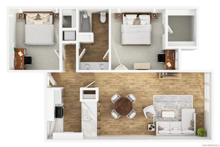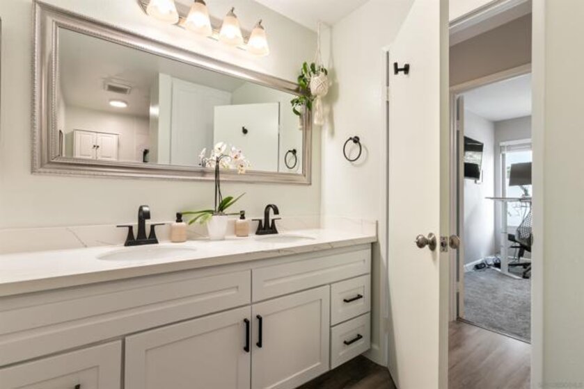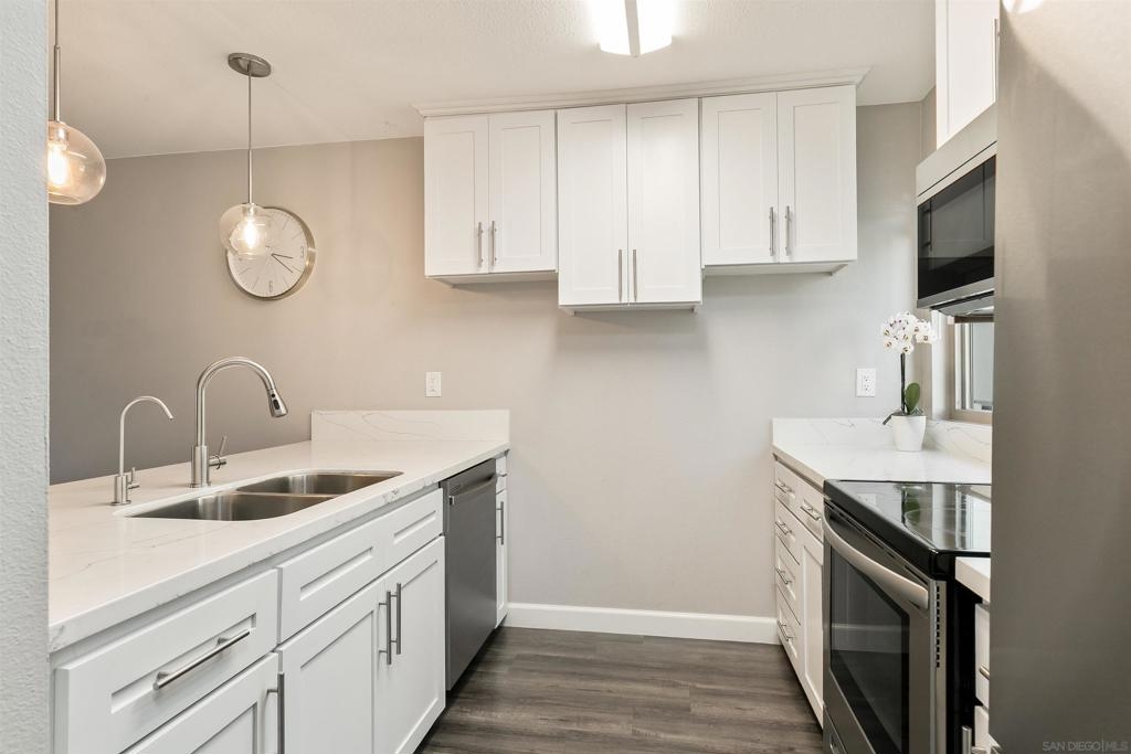 Centrally located in the heart of Clairemont, this fully renovated top-floor 2-bedroom, 1-bath condo is move-in ready and located within a gated community. The home features new windows and updated finishes throughout, creating a bright, modern living space. The kitchen has been completely remodeled with durable quartz countertops, slim shaker cabinetry with sleek hardware, stainless steel appliances, and new pendant lighting, opening seamlessly to the main living area. Additional highlights include a beautifully updated bathroom with a dual-sink vanity, tiled shower, and bathtub, a walk-in closet, a full-size washer and dryer conveniently located inside the unit, an upgraded electrical panel, and a reverse osmosis water filtration system. Community amenities include a pool and spa, along with recent complex upgrades such as all-new roofs and rebuilt balconies. Ideally situated near shopping, dining, major freeways, beaches, downtown San Diego, the airport, and SeaWorld, this turnkey condo offers modern, low-maintenance urban living in a highly central location.
