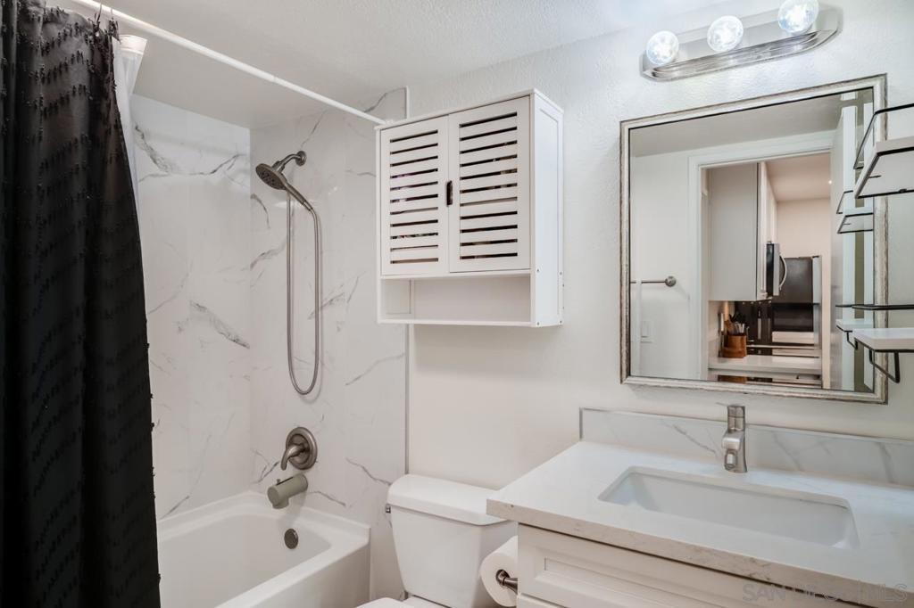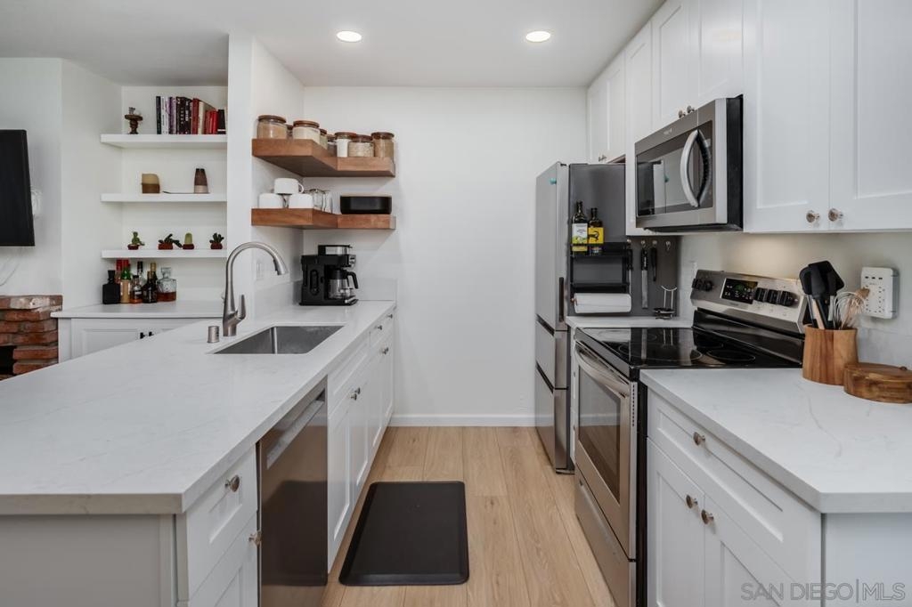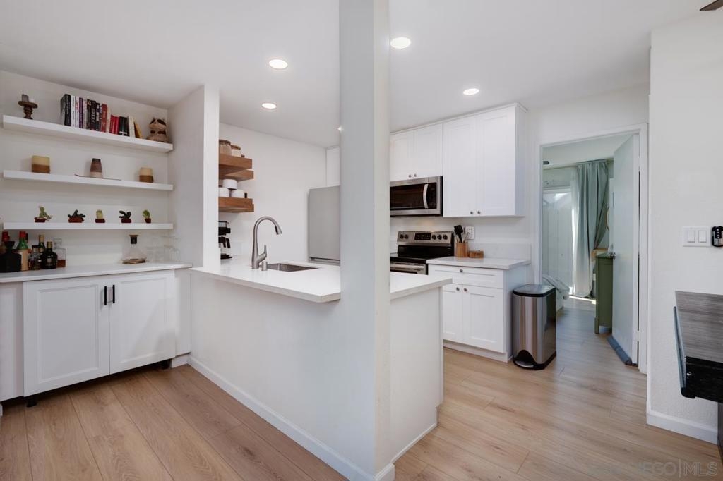 Beautifully renovated 2 bedroom, 2 full baths condo, with attached one-car garage! Plus, an extra parking spot in the driveway. This condo has luxury vinyl flooring throughout, quartz counter tops, new Shaker-style cabinetry in the kitchen and baths, recessed lighting in the kitchen, new Mitsubishi Mini-Split, custom floating shelves in kitchen, and new energy efficient windows and screen doors. Both bathrooms have been renovated with new bathtubs, vanities, sinks and faucets, quartz tub surrounds, and lighting. The condo has two patios - one in front and one in the back of the unit. This condo is centrally located close to schools, Kensington, North Park, restaurants and shopping, and both the 15 and 805 freeways.