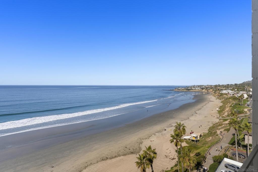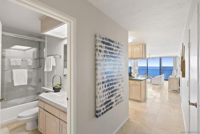 Enjoy remarkable floor-to-ceiling views of breaking waves, the coastline, and unforgettable sunsets from this premium high-floor 2-bedroom, 2-bath waterfront condo in North Pacific Beach. Beautifully maintained, the residence features custom tile flooring and beach-friendly finishes throughout, with an open-concept kitchen and breakfast bar that flows seamlessly into the great room overlooking the Pacific. Glass railings and a Juliette balcony create an effortless connection to San Diego’s ocean breezes and year-round coastal climate. The primary suite captures sweeping water views, while the secondary bedroom offers easterly vistas across Pacific Beach to the distant mountains. The home includes one garage parking space in an exceptionally convenient, easy-to-park location suitable for most SUVs. One of the few high-rise buildings directly along San Diego’s shoreline, The Capri by the Sea offers resort-style amenities including fob access, an attended lobby, elevators, pool and spa, beach shower, sauna, and a rooftop deck with BBQs. The building is also among the limited beachfront properties that allow short-term rentals. Public beach access by ramp is located directly in front of the building along the boardwalk.