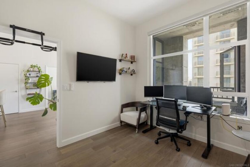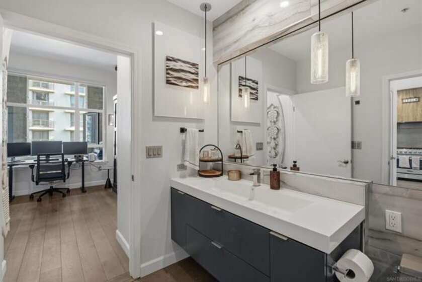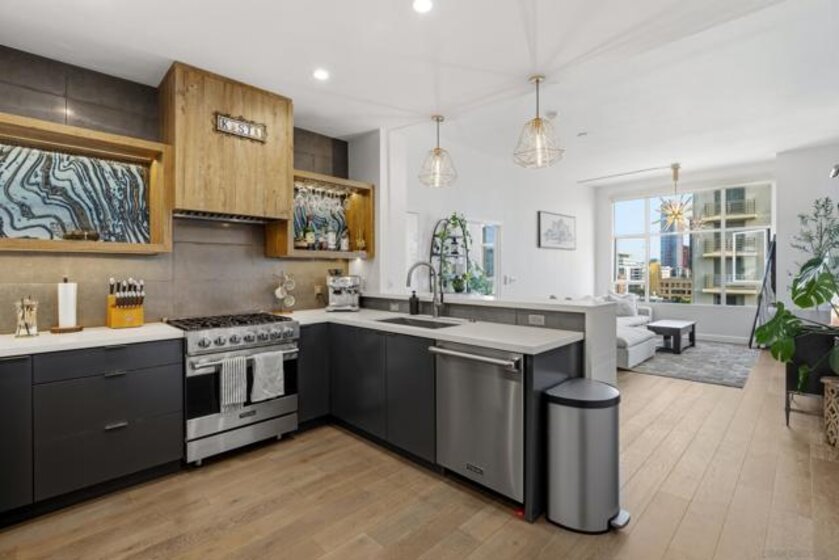 Truly one of a kind, professionally designed 10th-floor residence in the highly sought-after Trellis community. This extensively upgraded contemporary home showcases a stunning open layout with engineered oak flooring, designer lighting, and a private balcony. The award-winning kitchen features quartz countertops, Viking appliances, custom mixed-material cabinetry, and Tuscan cypress shelving, opening seamlessly to the living area. The spacious primary suite offers generous closet space and a beautifully updated bath with custom vanity and refined finishes. Trellis amenities include secured entry, courtyard with BBQ area, fitness center, and assigned underground parking. Ideally located in the heart of downtown, moments from the Gaslamp Quarter, Petco Park, dining, shopping, and entertainment.