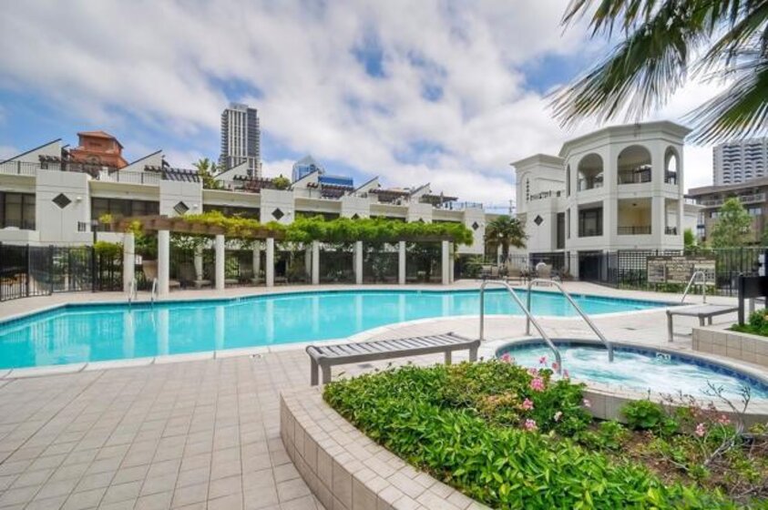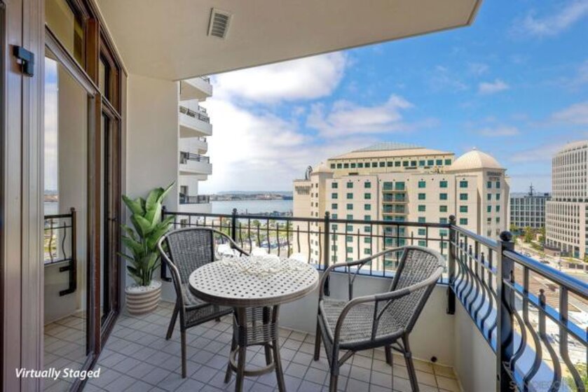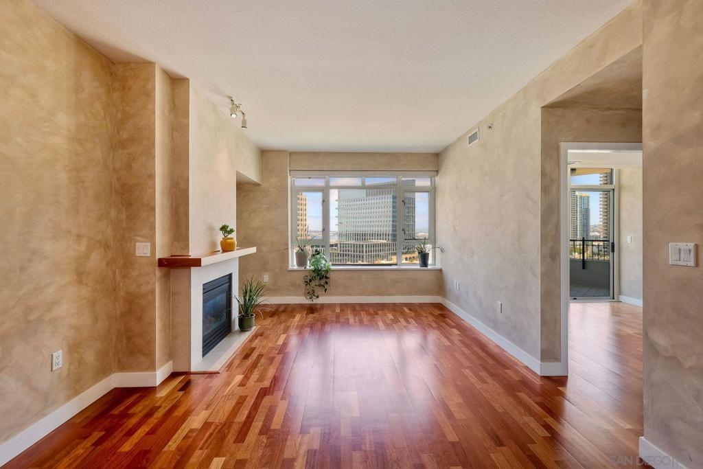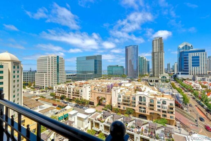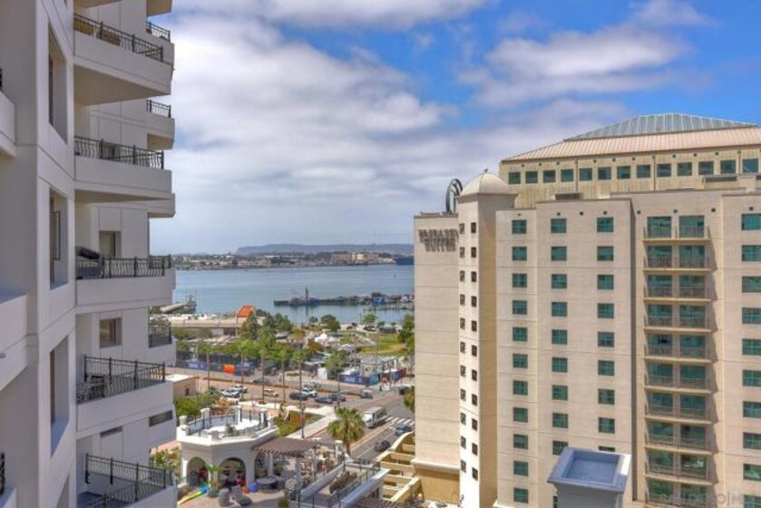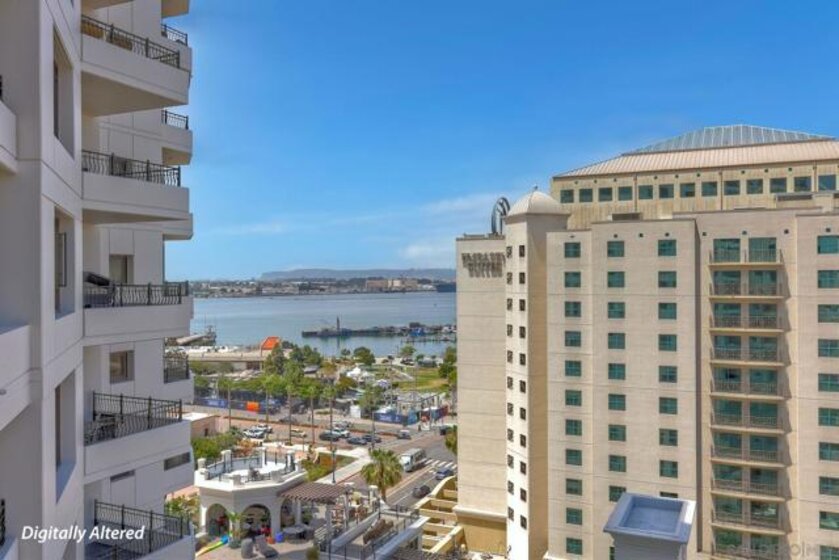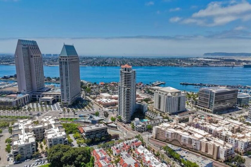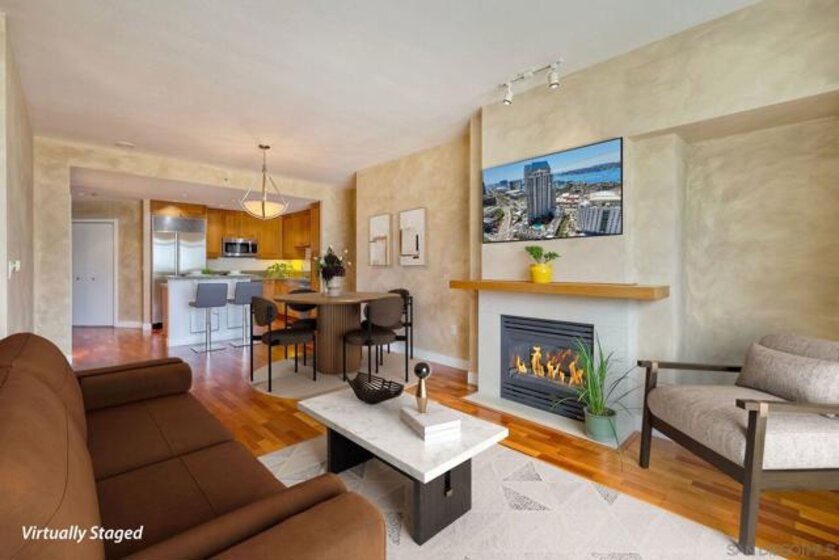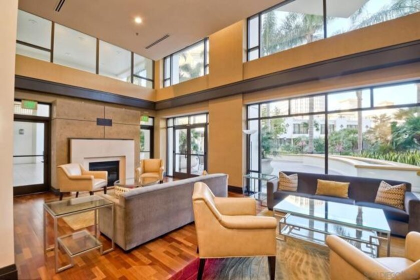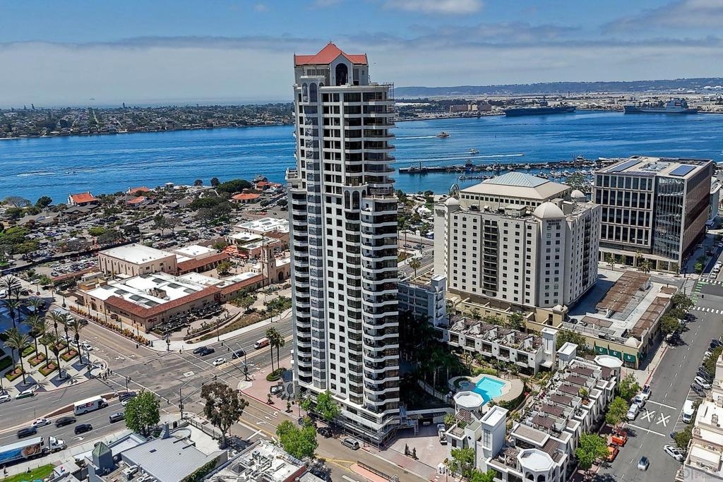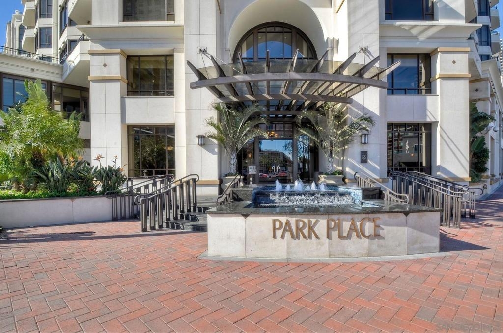 Discover elevated urban living on the 13th floor of Park Place, located in San Diego’s prestigious Marina District. This stunning 1-bedroom + den/office (easily used as a second bedroom) comes with HOA credits and sweeping panoramic views of the bay & city skyline. Inside, this home features elegant cherry wood flooring and custom faux-finish walls throughout the main living areas, bedroom, and den—creating a warm, designer-inspired ambiance. The gourmet kitchen is appointed with stainless steel appliances, a Sub-Zero refrigerator, granite countertops, and a central island with bar seating—ideal for entertaining. The spacious primary suite boasts triple mirrored closets and a luxurious en-suite bath with a soaking tub and walk-in shower. Step onto your private balcony—accessible from both the primary bedroom and the den—to take in breathtaking views morning and night. A second full bathroom provides added flexibility, especially if the den is converted into a guest room or second bedroom. Additional features include two tandem parking spaces, a private storage unit, and access to world-class amenities: a striking lobby, 24-hour concierge, gated security, pool, spa, fitness center, resident lounge, and guest parking. Enjoy resort-style living just steps from Seaport Village, the Convention Center, Petco Park, and Downtown's vibrant dining and nightlife.