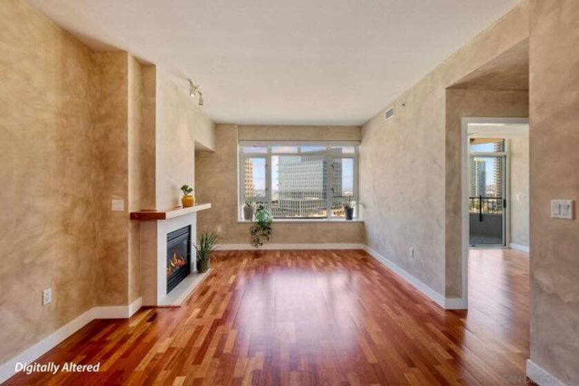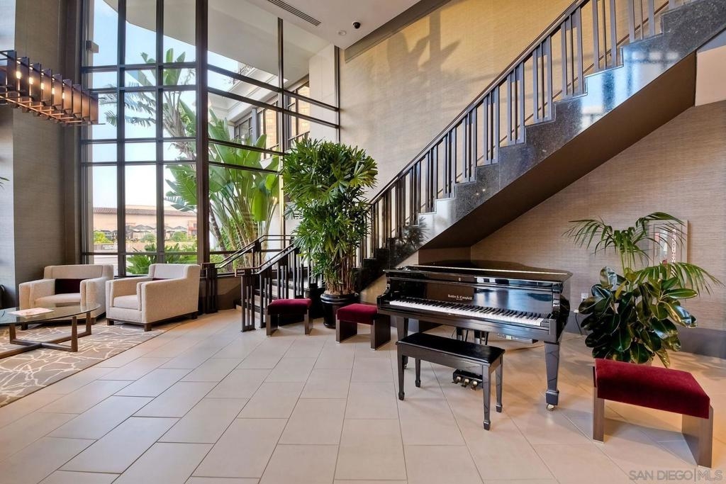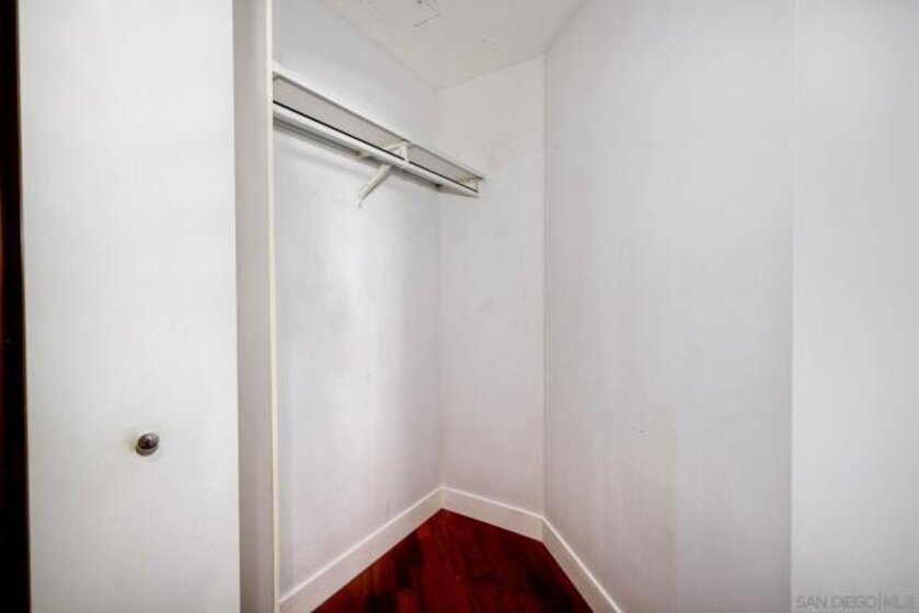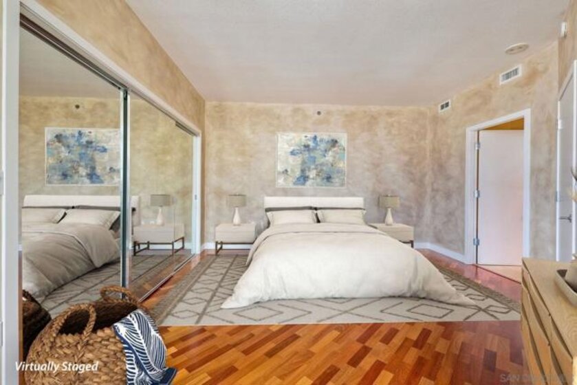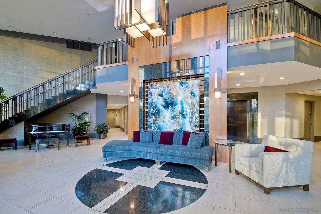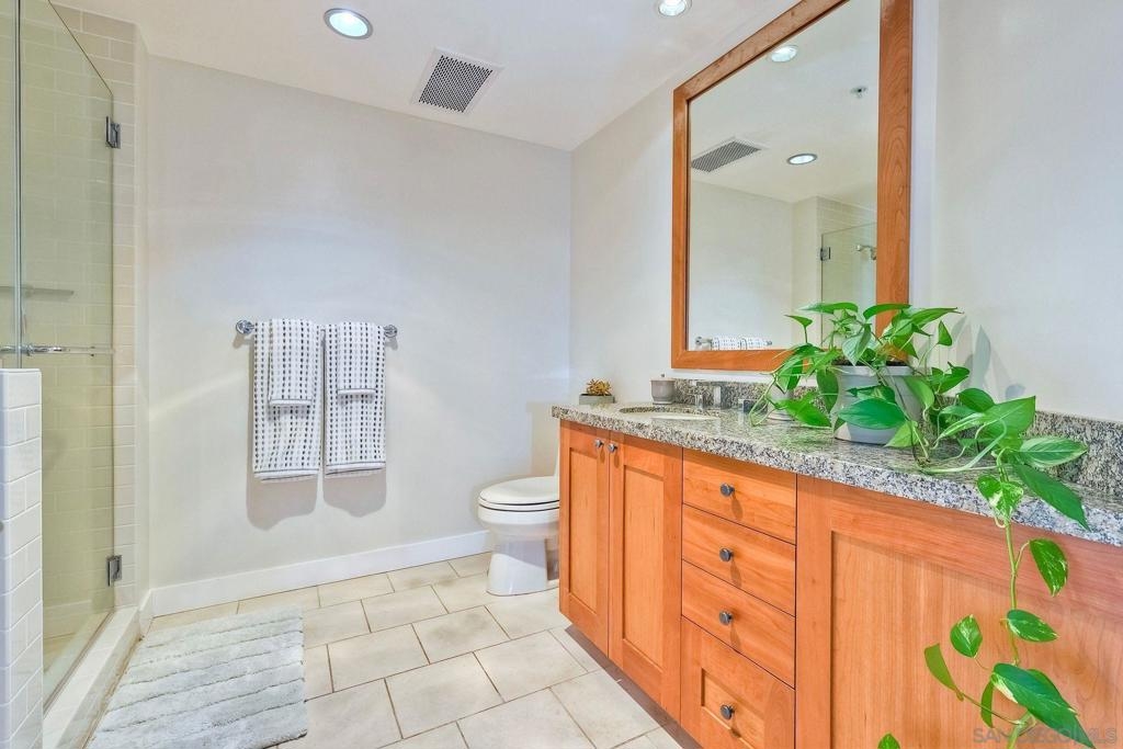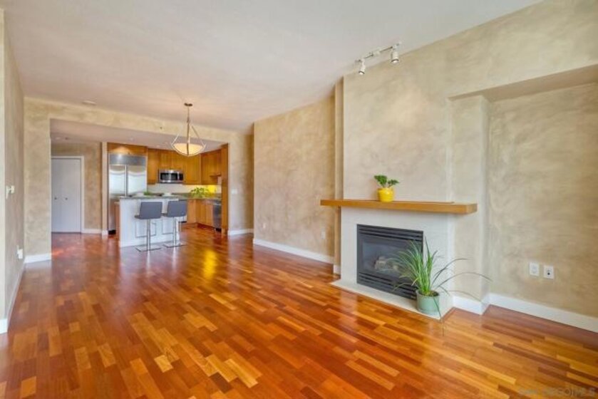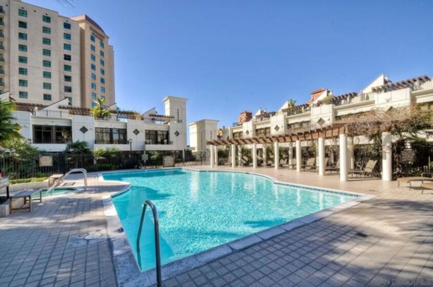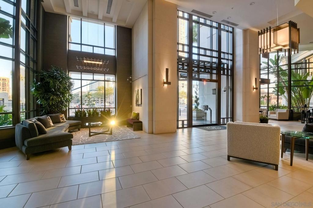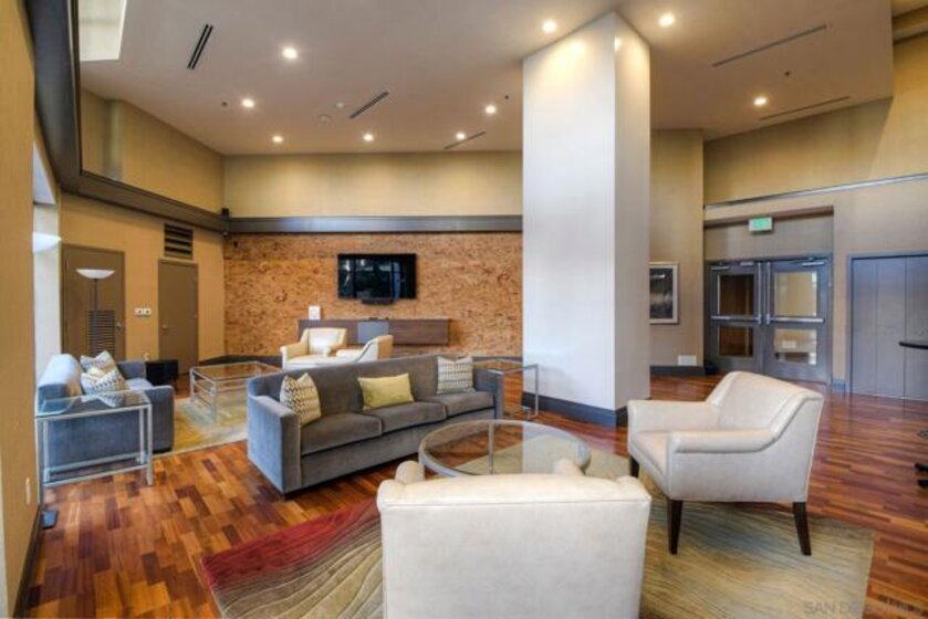 Discover elevated urban living on the 13th floor of Park Place, located in San Diego’s prestigious Marina District. This stunning 1-bedroom + den/office (easily used as a second bedroom) comes with HOA credits and sweeping panoramic views of the bay & city skyline. Inside, this home features elegant cherry wood flooring and custom faux-finish walls throughout the main living areas, bedroom, and den—creating a warm, designer-inspired ambiance. The gourmet kitchen is appointed with stainless steel appliances, a Sub-Zero refrigerator, granite countertops, and a central island with bar seating—ideal for entertaining. The spacious primary suite boasts triple mirrored closets and a luxurious en-suite bath with a soaking tub and walk-in shower. Step onto your private balcony—accessible from both the primary bedroom and the den—to take in breathtaking views morning and night. A second full bathroom provides added flexibility, especially if the den is converted into a guest room or second bedroom. Additional features include two tandem parking spaces, a private storage unit, and access to world-class amenities: a striking lobby, 24-hour concierge, gated security, pool, spa, fitness center, resident lounge, and guest parking. Enjoy resort-style living just steps from Seaport Village, the Convention Center, Petco Park, and Downtown's vibrant dining and nightlife.