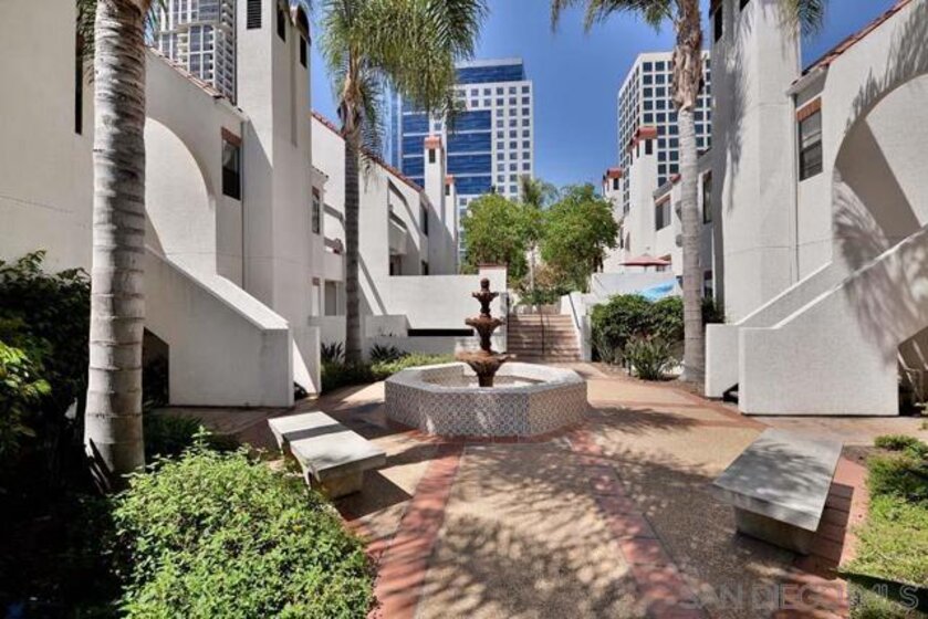 Welcome to this rare, single-level ground-floor residence with 2 bedrooms, 2 bathrooms AND 2 patios! With a bright and open layout and sunlight streaming in from every angle, it’s the kind of home that just feels good the moment you step inside. Enjoy the brand-new “Bentwood Tan” luxury vinyl plank flooring throughout, cozy ambient fireplace, and a “refreshed” kitchen with sleek quartz counter, top-notch Samsung appliances, refaced cabinetry and newer fixtures. The spacious primary suite offers dual closets and an ensuite bath with a step-in shower, while both bedrooms open directly to the patios—perfect for seamless indoor-outdoor living. Other features include LED lighting, a bonus storage closet on the patio, a secure parking space, private storage cabinet and fresh paint throughout. All this in Park Row, one of Downtown’s most charming low-rise communities, known for its lush landscaping, fantastic amenities, and unbeatable walkability. And yes—low HOA dues, too! There is no other development like Park Row in Downtown; beautiful garden-setting with sparkling fountains, a plethora of flowers, trees, real green grass and courtyards to boot. With no elevators, long corridors or hallways; rather “ease of access” walk-up style residences, it offers a serene escape for those seeking the charm of urban living without the high-rise hustle. Nestled beside the historic Pantoja Park, this tranquil community invites you to stroll to The Headquarters, Seaport Village, the Gaslamp Quarter, and the scenic waterfront, with Downtown San Diego's cultural highlights just steps away. Beautifully landscaped grounds enhance the peaceful ambiance, while amenities such as clubhouse, year-round heated pool, and spa create a relaxing retreat. Plentiful visitor parking is an added perk, and additional parking, storage options, bike storage, and an EV charging station are available through the HOA. Embrace the perfect balance of city convenience and peaceful living at Park Row—welcome home!