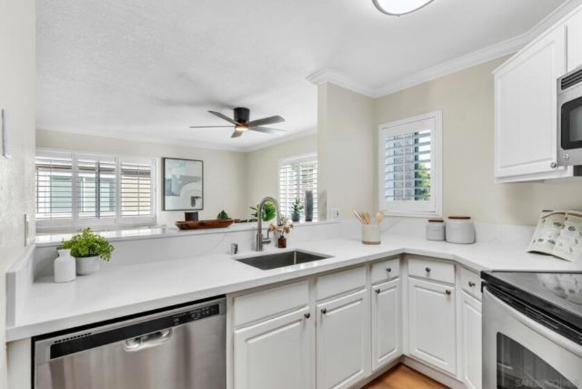 Welcome to this beautifully upgraded 1-bedroom, 1-bath upper corner unit in the desirable Verano community of University City, featuring a prime location within the complex. This light-filled home has been thoughtfully refreshed throughout with new flooring, including luxury vinyl plank flooring in the living areas for increase durability and high-end, low-pile carpet in the bedroom. The kitchen and bathroom have been tastefully upgraded, complemented by fresh interior paint and new fixtures, making this home truly move-in ready. Enjoy the privacy of an upper-level corner unit ideally situated near the pool, while still offering a peaceful residential feel. Parking is convenient with one garage space plus one permitted parking spot. Verano offers a resort-style lifestyle with multiple pools, a fitness center, and well-maintained common areas. Ideally located just a short walk to La Jolla Colony Park, with close proximity to Doyle Community Park & Rec Center, local shopping + dining, and with easy access to major freeways, this home offers exceptional comfort, convenience, and lifestyle in the heart of University City.