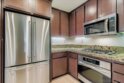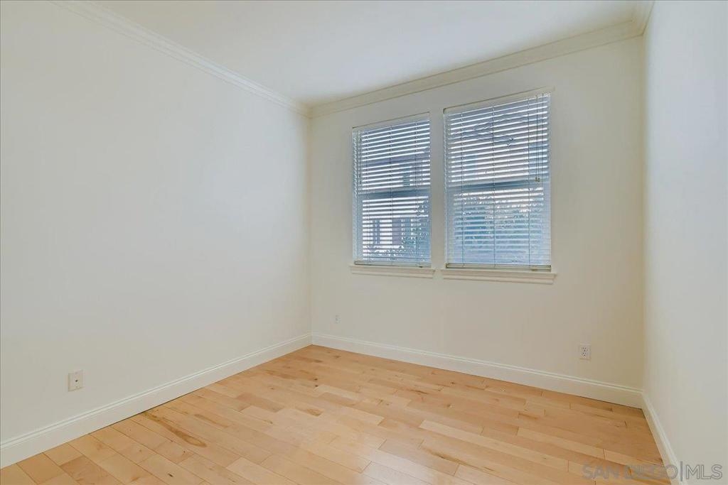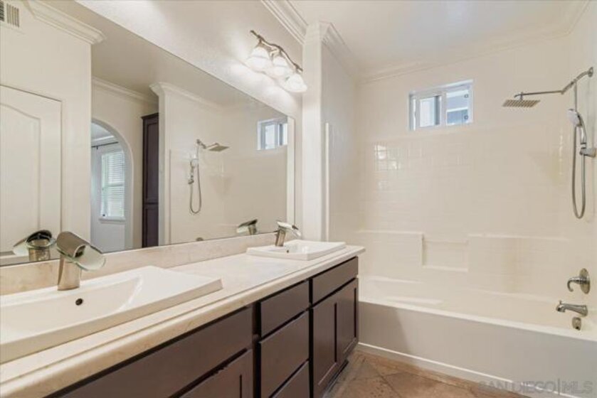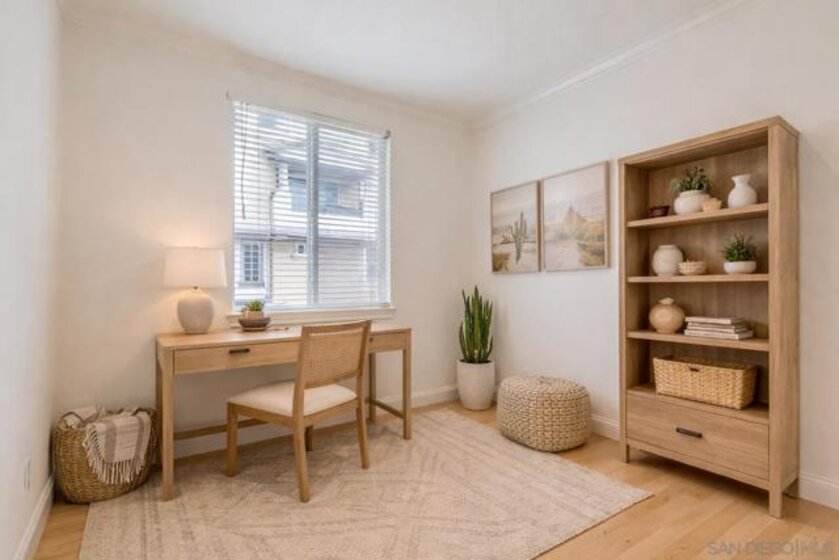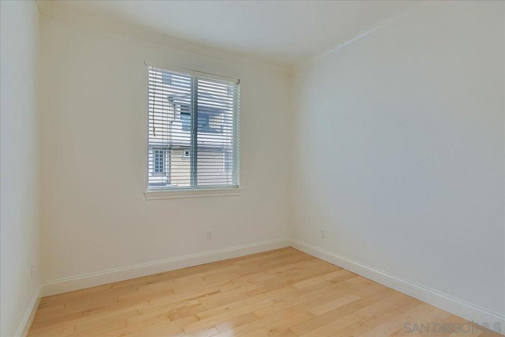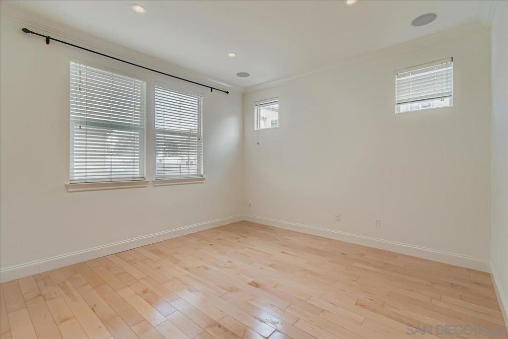 Welcome to this beautifully upgraded single-level corner condo that truly checks all the boxes. Offering 3 bedrooms, 2 bathrooms, and 1,320 sq ft of thoughtfully designed living space, this home blends modern finishes with everyday comfort in a way that feels elevated yet welcoming. The open living and dining area is filled with natural light and opens to a spacious front balcony, perfect for morning coffee or evening relaxation. Canadian Maple wood flooring runs throughout the main living spaces, complemented by Italian tile at the entry and timeless designer details. The kitchen is both stylish and functional, featuring granite countertops, a breakfast bar for casual dining, stained cabinetry with adjustable shelving, and stainless-steel appliances, including a new refrigerator, microwave, oven, and range. A built-in desk adds flexibility for work-from-home needs or additional storage.The primary suite offers a peaceful retreat with an arched entry into the primary bath, where you’ll find upgraded countertops, upgraded sinks and fixtures, and heated floors for a spa-like feel. The secondary bathroom continues the elevated look with stone tile and quality finishes. Additional features include a whole-home water softener system, built-in surround sound speakers in the living room, newer central air and heating, a newer water heater, fire sprinklers, and smart-home conveniences throughout. A rare highlight is the direct-access, full-size two-car garage, fully drywalled and finished with storage space, a new smart garage door opener, and two additional side-by-side parking spaces, providing a total of four parking spots. Residents enjoy access to the Promenade community fitness room and BBQ pavilion, all within the centrally located Spectrum neighborhood of San Diego. With easy freeway access, nearby shopping and dining, and a YMCA and restaurants just two blocks away, this home offers contemporary, low-maintenance living in an unbeatable commuter-friendly location.