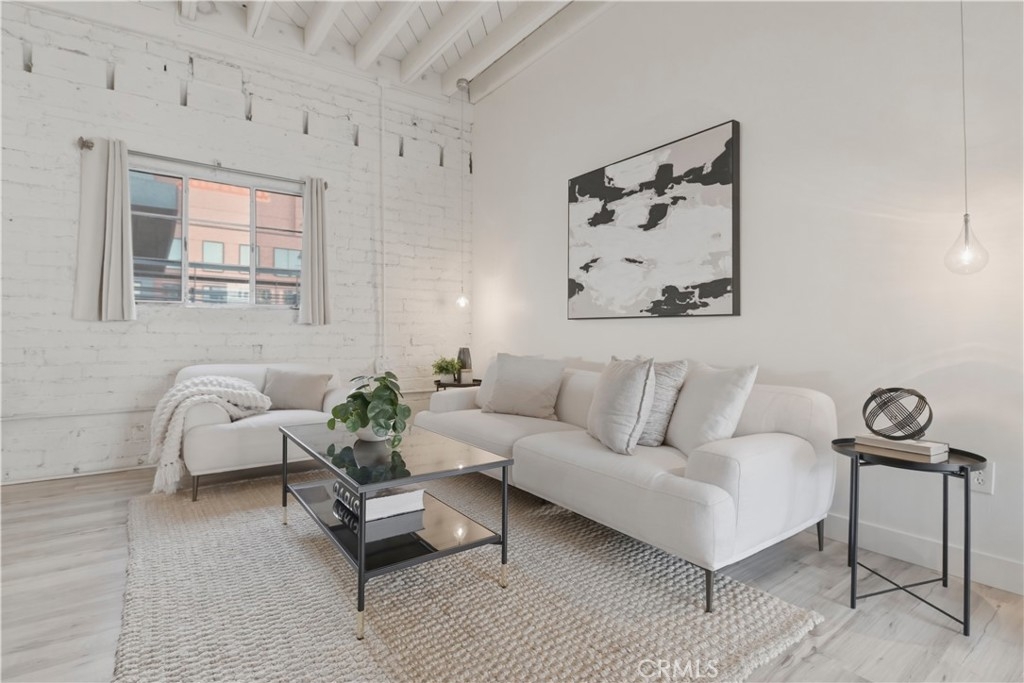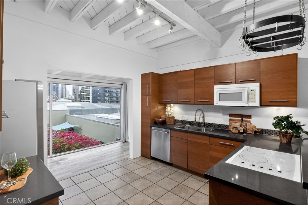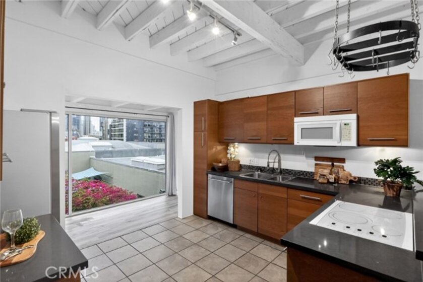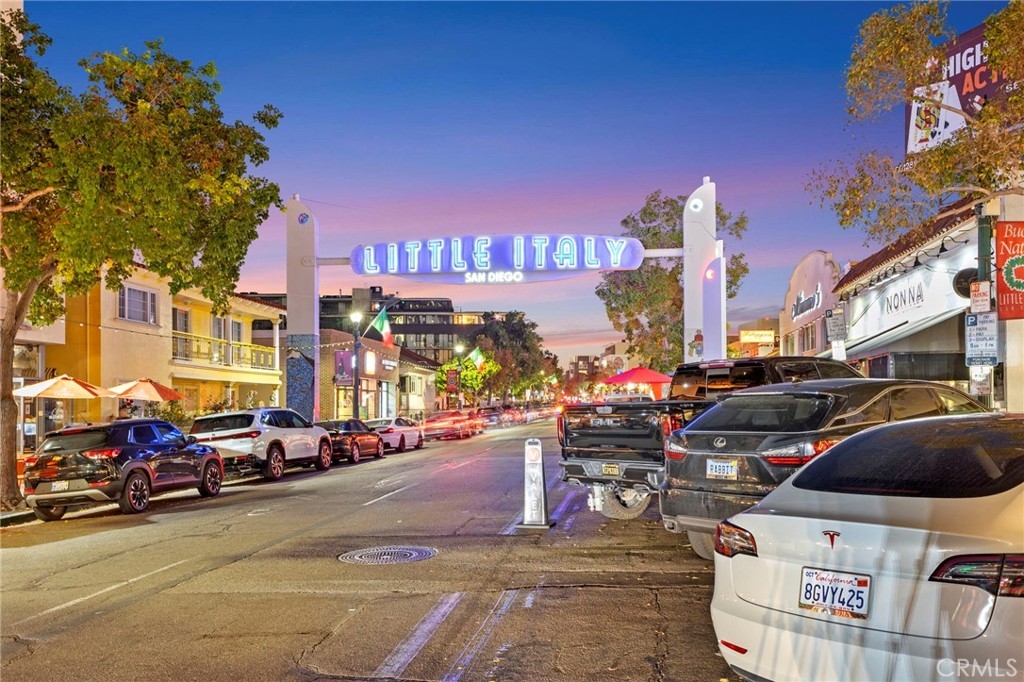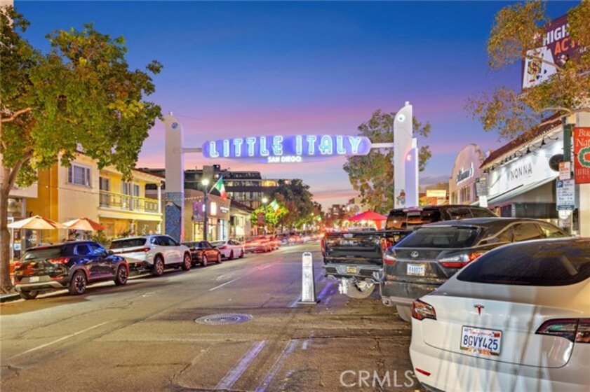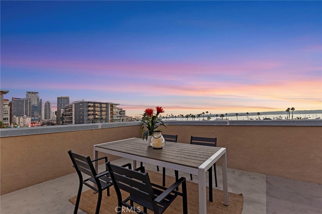 Jonathan Segal-designed loft in the heart of Little Italy, blocks from San Diego Bay. This 2 bedroom, 2 bath condo offers open-beam ceilings throughout, skylights, an exposed brick accent wall, and expansive windows that fill the home with natural light. The open kitchen features quartz counters, a breakfast bar, and stainless-steel appliances, connecting to the dining and living areas with views toward the bay and downtown skyline. Both bathrooms have been fully remodeled with modern vanities, elegant tile, a deep soaking tub, and glass-enclosed shower. A light-filled bonus room with bathroom access offers flexibility as an office, studio, or third bedroom. Step up to your dedicated rooftop area and take in sunset views over the marina, and the downtown skyline, accessed directly from the unit. Additional features include in-unit laundry, one gated covered parking space, and a storage closet. Located blocks from the weekly Mercato farmers market, India Street dining, cafes, and the bay, in one of San Diego's most walkable neighborhoods.